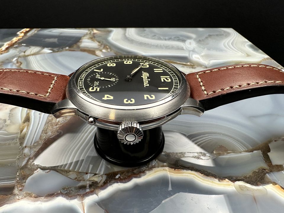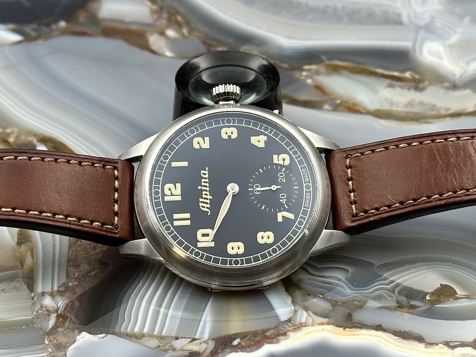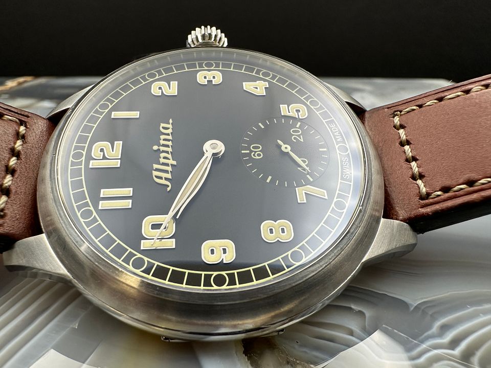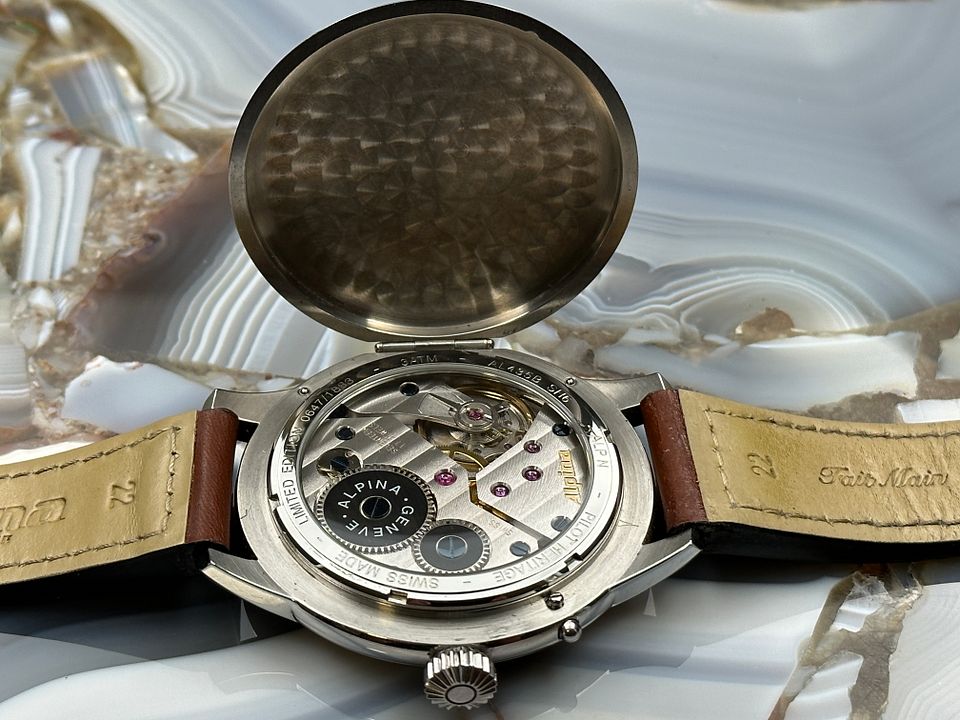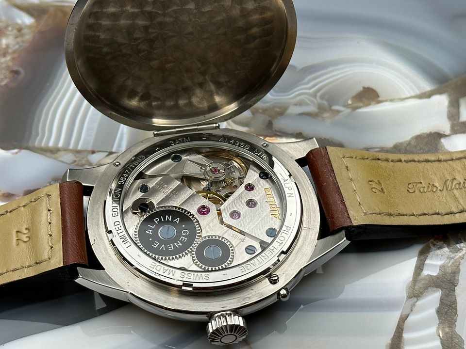 Alpina Startimer Heritage Pilot AL-435BN4SH6 is a truly impressive Swiss Made mechanical watch. This watch pays hommage to the true, real pilot watches and has an impressive diameter of 50mm. While not for the faint of heart (or wrist), this watch is extremely well made with sapphire glass, a comfortable leather strap and a mechanical movement, the Alpina AL-435, which is based upon the renown ETA/Unitas 6498. This movement is also visible through the caseback, which can be opened with a button on the side of the case.