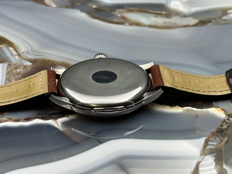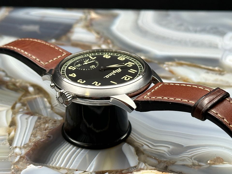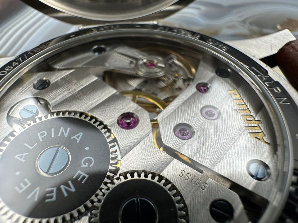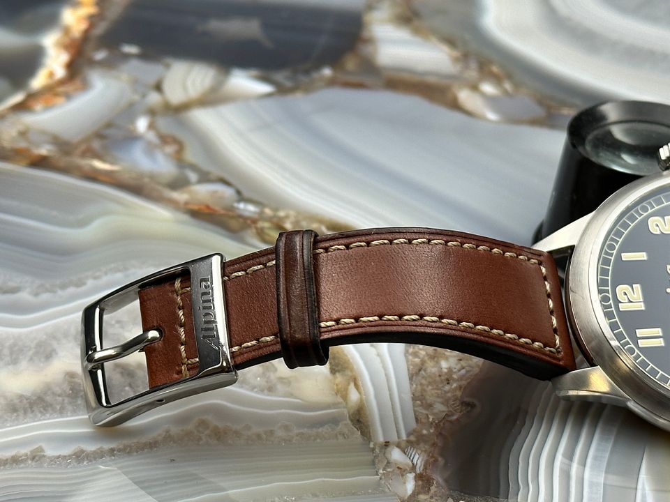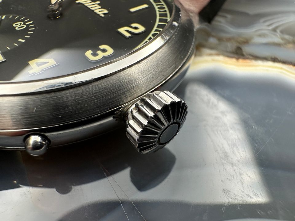 Alpina Startimer Heritage Pilot AL-435BN4SH6 is a truly impressive Swiss Made mechanical watch. This watch pays hommage to the true, real pilot watches and has an impressive diameter of 50mm. While not for the faint of heart (or wrist), this watch is extremely well made with sapphire glass, a comfortable leather strap and a mechanical movement, the Alpina AL-435, which is based upon the renown ETA/Unitas 6498. This movement is also visible through the caseback, which can be opened with a button on the side of the case.