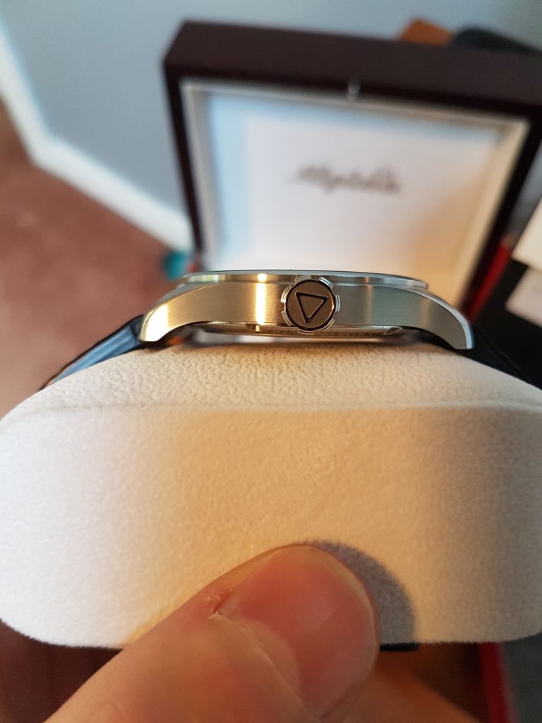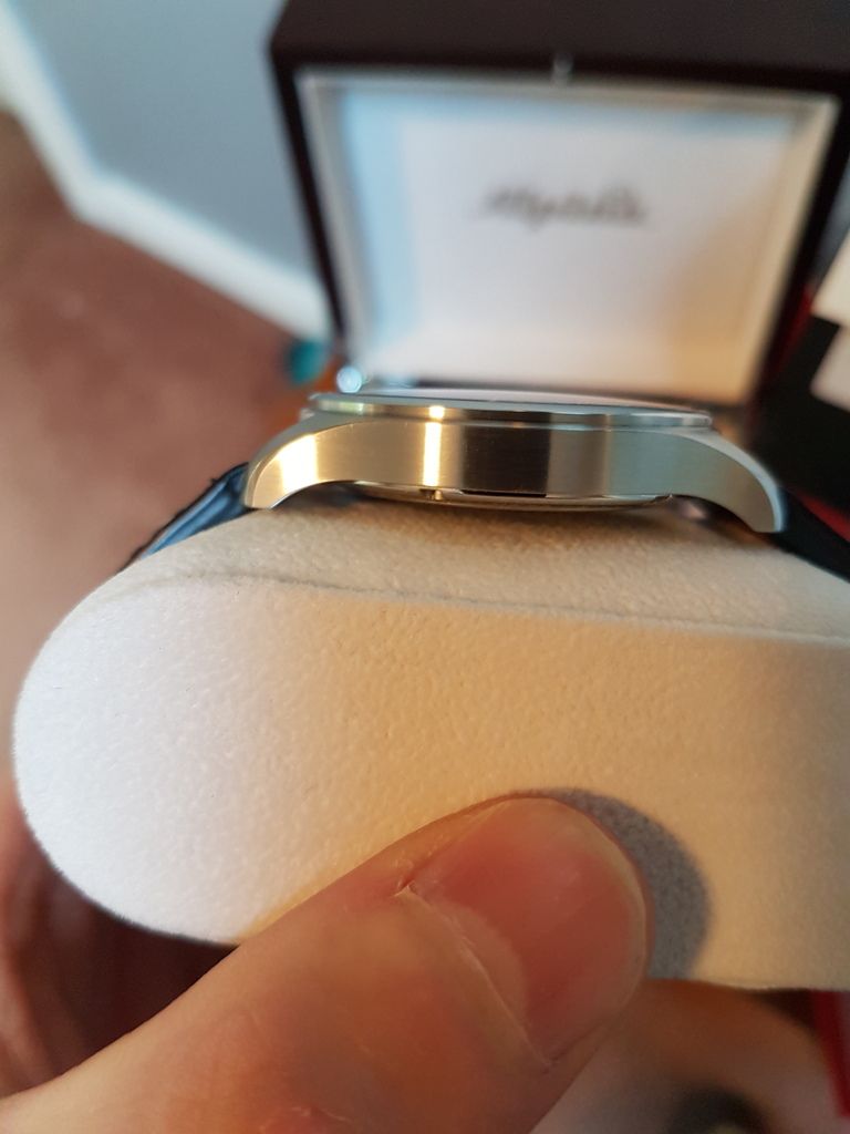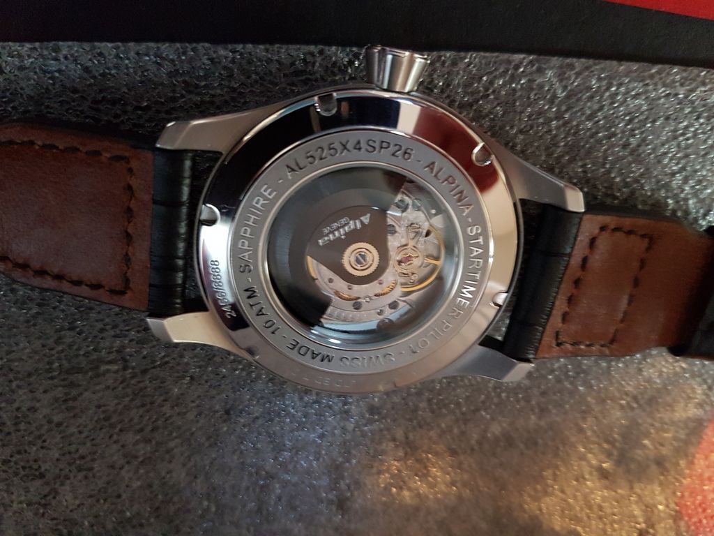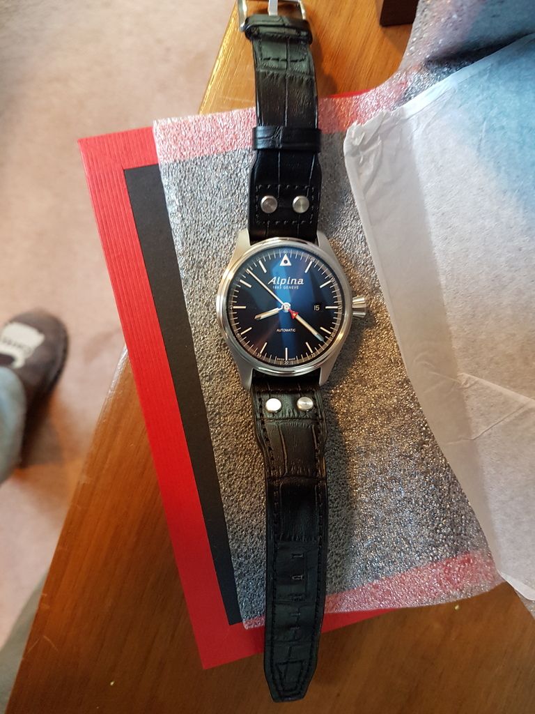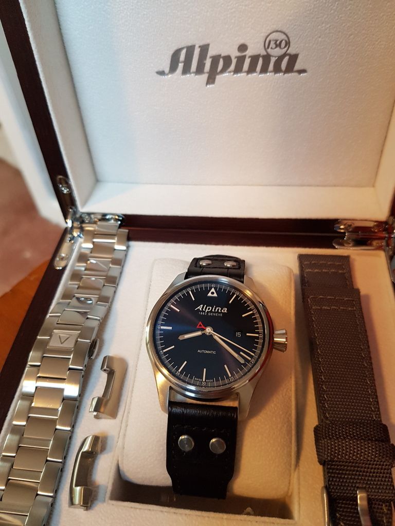 This is a LE Alpina Startimer pilot blue dial 45.5mm WOC and quite thin 11mm or so . Screw down crown .