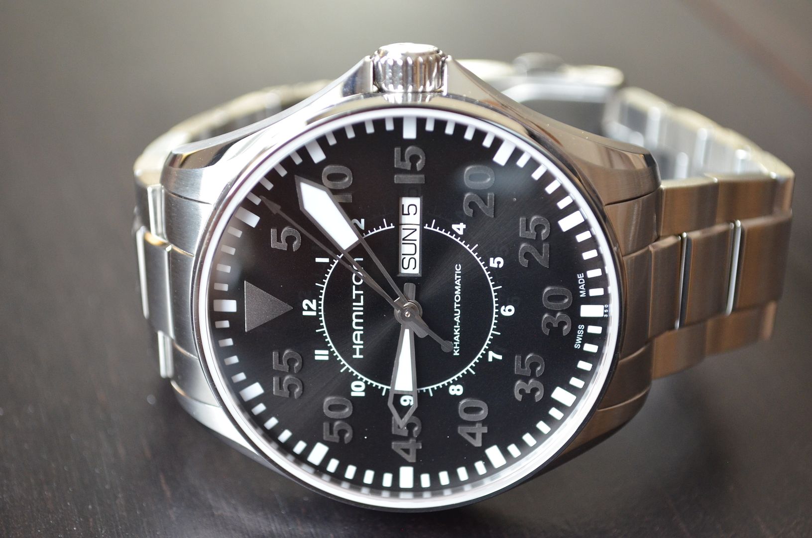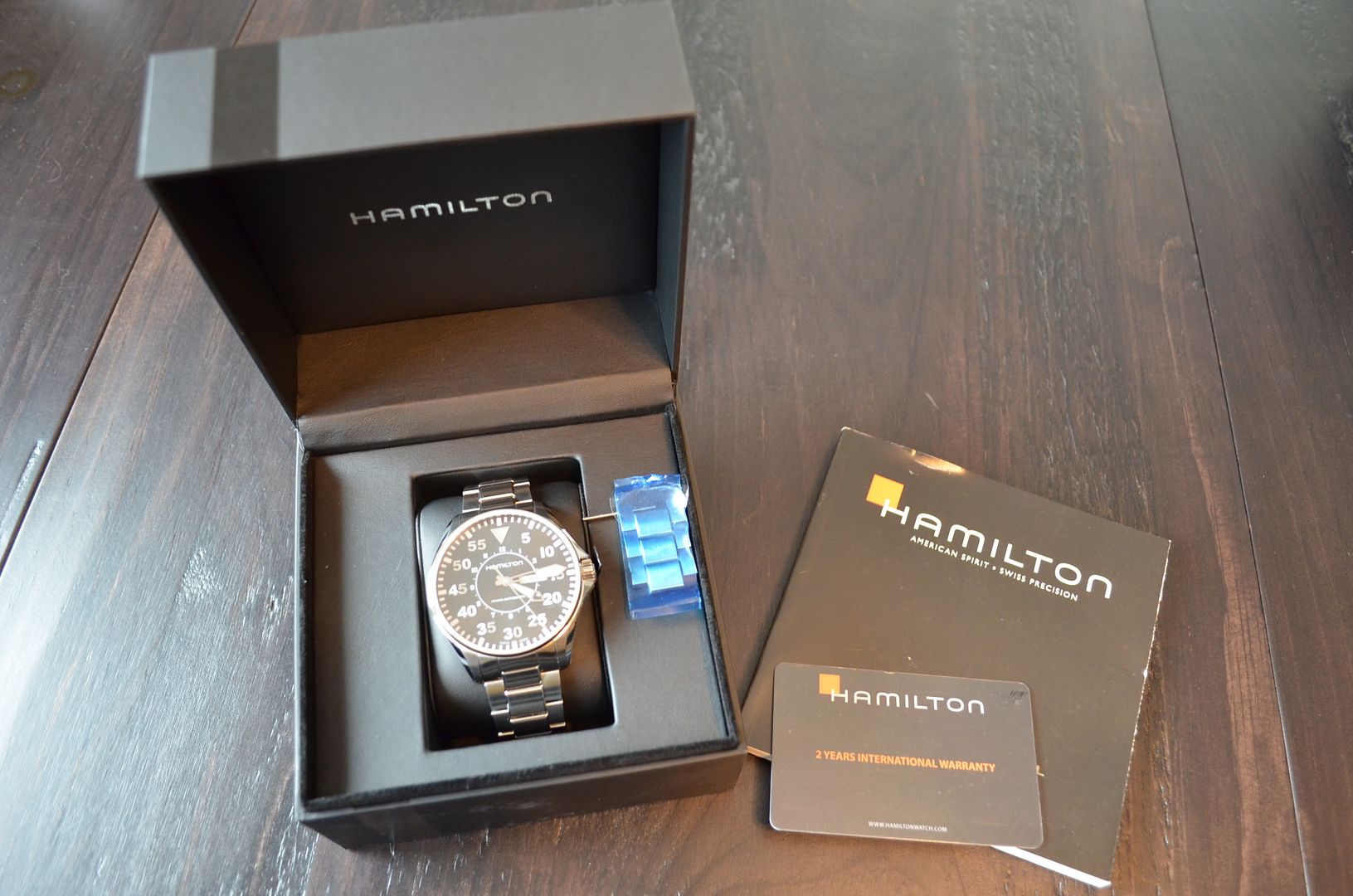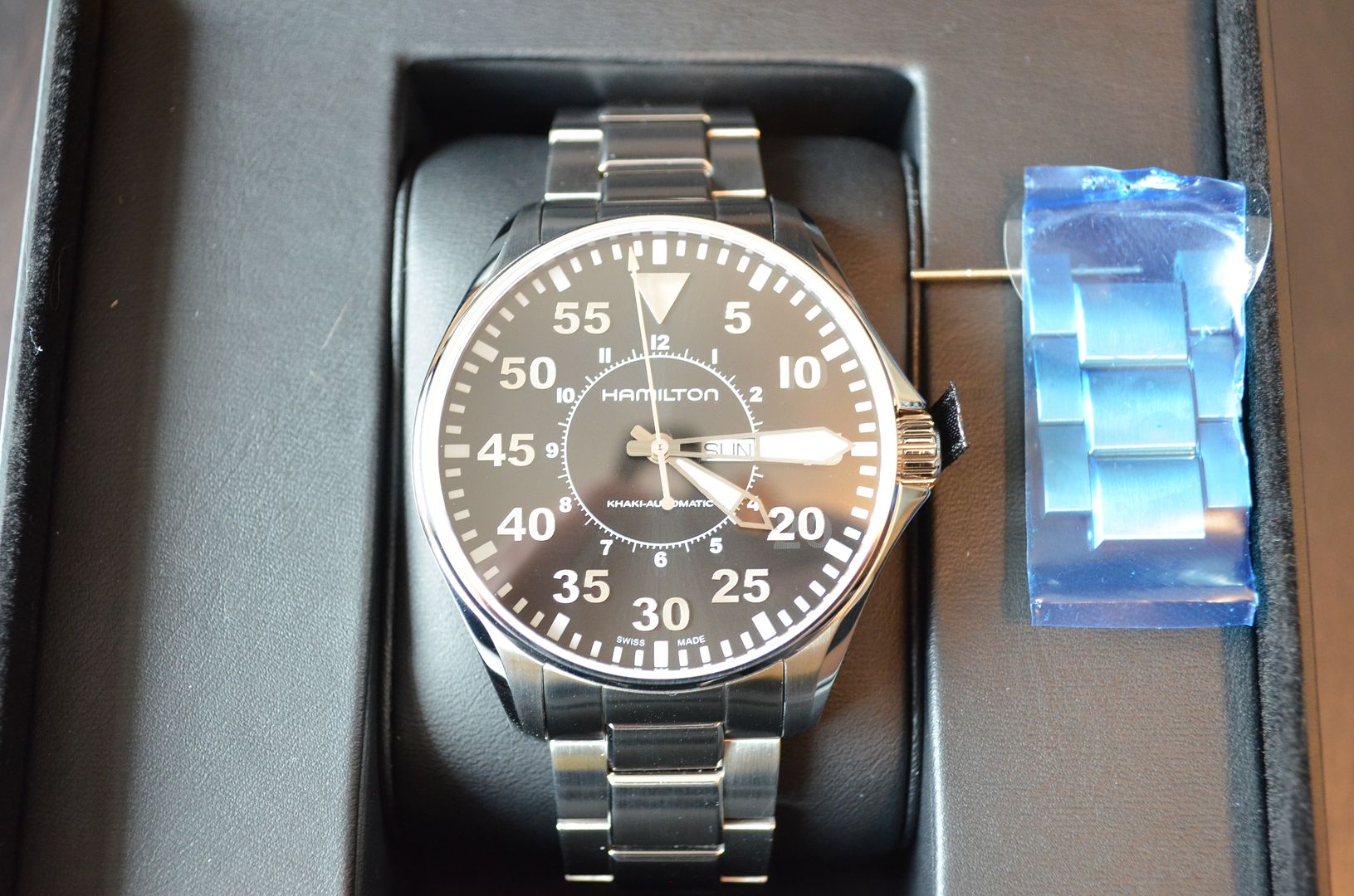 Hello I have my Hamilton Khaki Pilot Day/Date on a bracelet for sale. The watch was only worn a few times and it is great shape as the pictures will show. The watch is sized to fit an 8" wrist loose and has extra links included. I bought the watch new and it comes with everything it comes with new. I have had it for about 5 months so there is a lot of warranty left. I am just not wearing it. I would entertain trade offers for the right watch. Sorry about the lint and fingerprints in the pictures.