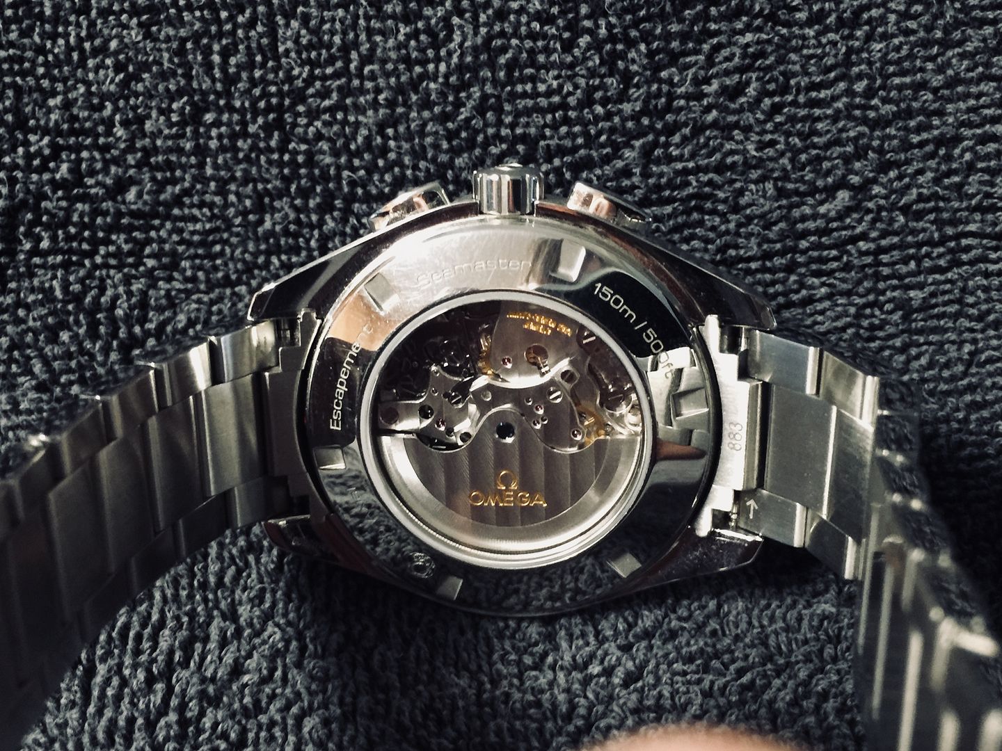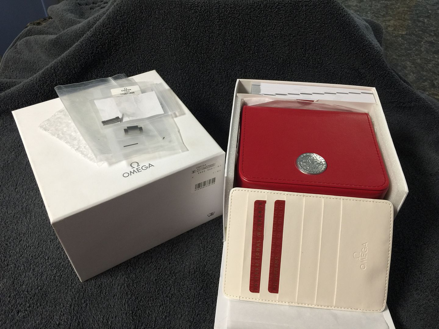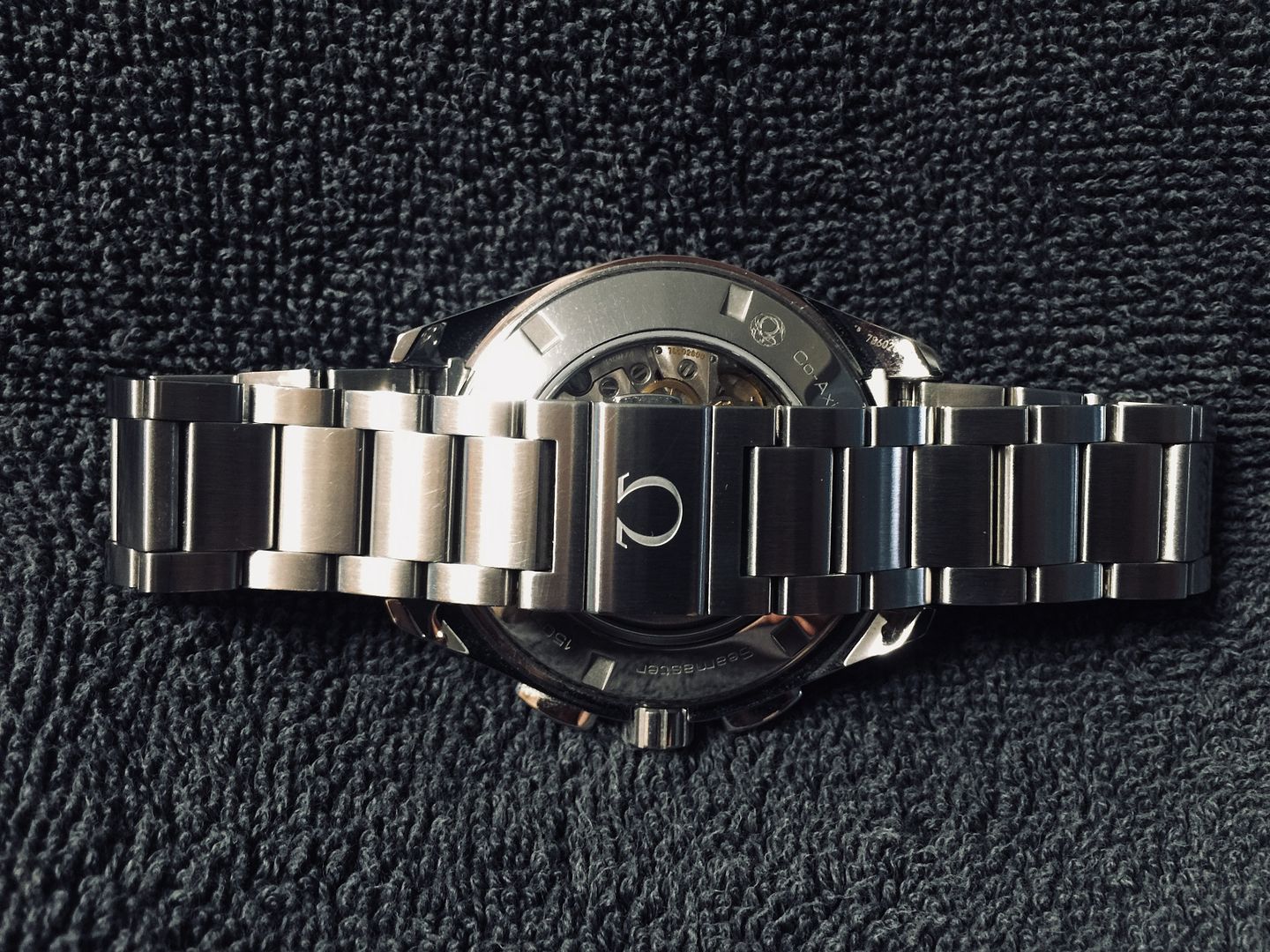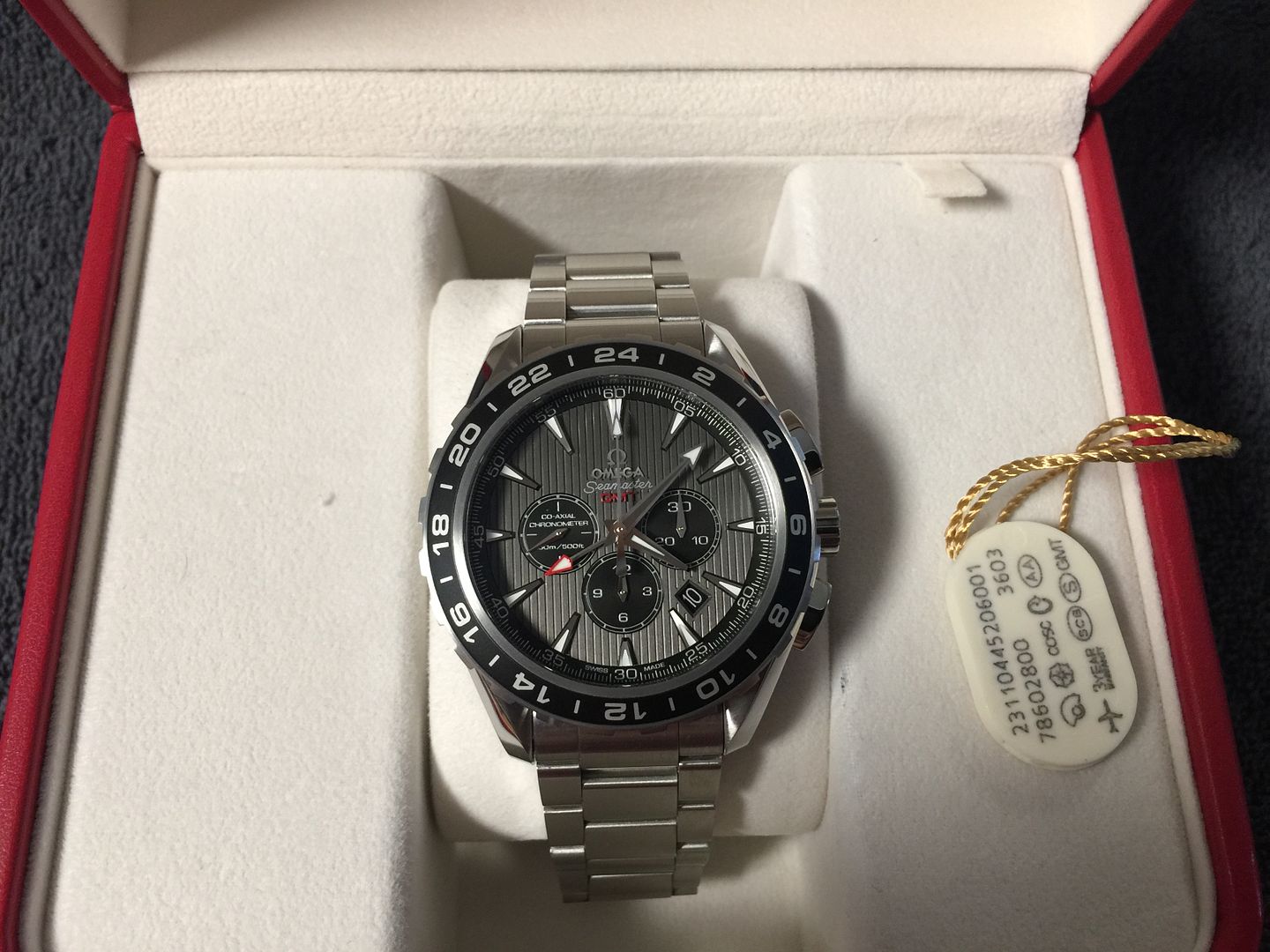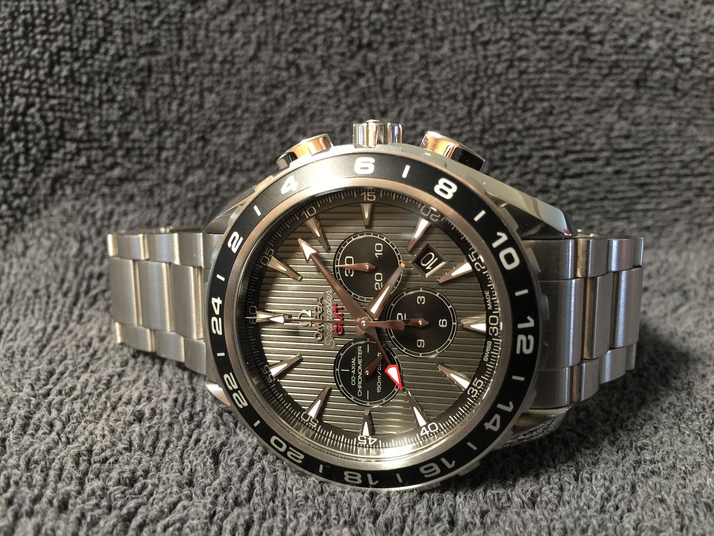 I have my Omega Aqua Terra Chrono GMT for sale and it comes complete with Boxes, booklets and cards. The watch is in great condition and it is a great looking watch. The case, dial, bezel and crystal are all mark free, the Bracelet has a couple small marks on the clasp but very faint. The chrono functions as it should and resets back to zero. The pictures attached show the condition as of today and include everything that comes with the watch. The bracelet is sized for an 8" wrist loose and has 1 extra link (Brand new), 1 extra half link.