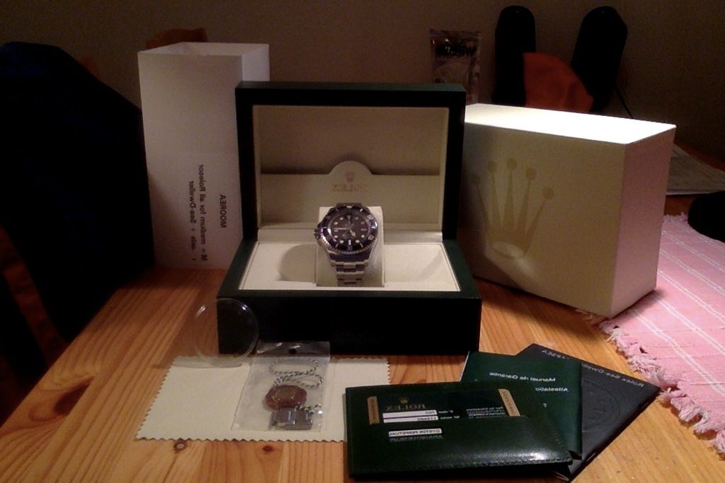 Watch comes with all the goodies such as the green box, outer box and sleeve. All paper work including sales receipt from dealership purchased will be provided with the watch. I have the warrantee card, however, it was filled in by the dealership. You will also get the users manual, bezel protector, COSC hangtag, warrantee booklet, leather green wallet, green leather cloth, and extra links and hardware when I had the bracelet sized by Rolex Canada (As pictured)