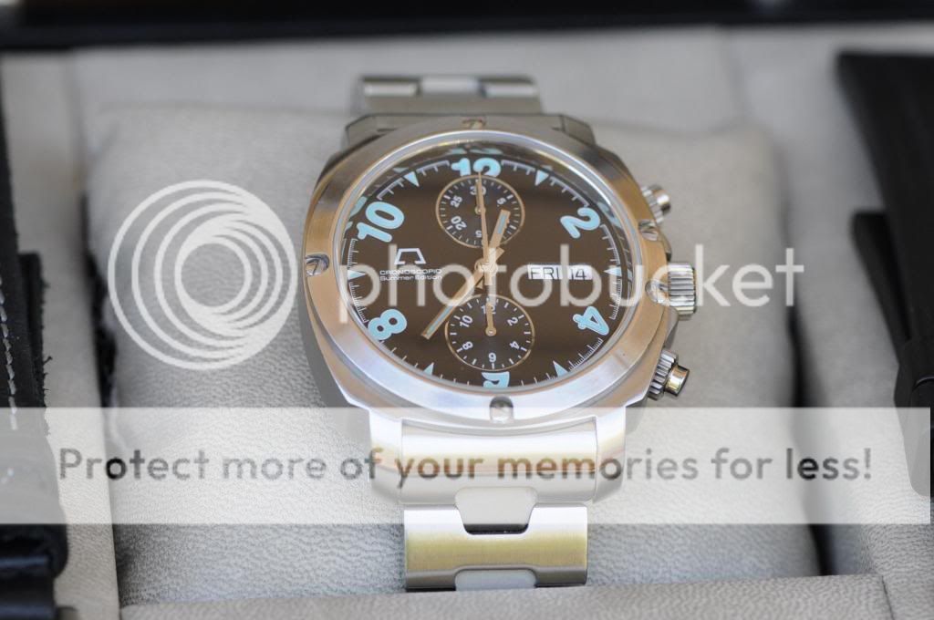 For sale is my Anonimo Chronoscopio "Summer Edition" rated 93% with slight swirls but no nicks. The crystal is 100%. I cant say enough about the beauty of this watch, the blue numbers on the dial are perfect on this all steel watch, its big and heavy but wears comfortably . This is a compete package wth an unfilled warranty card, complete boxes, papers. This watch includes the OEM steel bracelet and The original Kodiak leather strap with anonimo buckle in like new condition. I will also include a after market rubber strap that complements this watch beautifully.