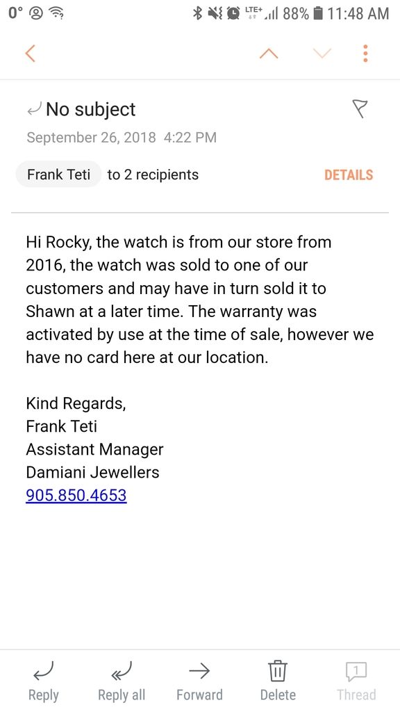 The watch is priced this low because it's missing the warranty card when I purchased it from watchfinder. They misplaced the card. It comes with the box, manual, booklet, receipt from watchfinder and email from Damiani Jewellers authenticates the watch.