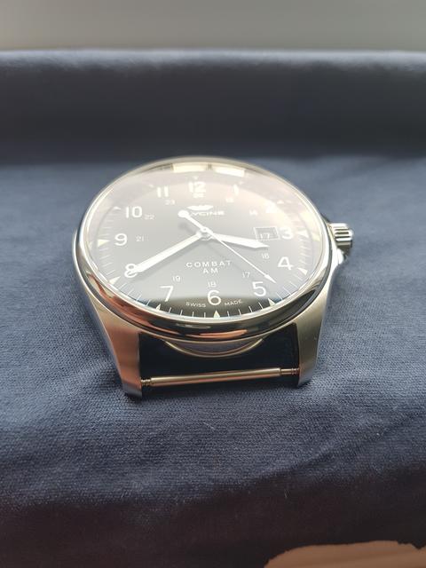 Condition is very good. Only a few light swirls on the polished bezel and a couple strap changing marks. Sapphire with Anti reflective treatment is flawless. The Nato strap is original Glycine and is unworn. Comes with box, papers and hang tag as when new.
