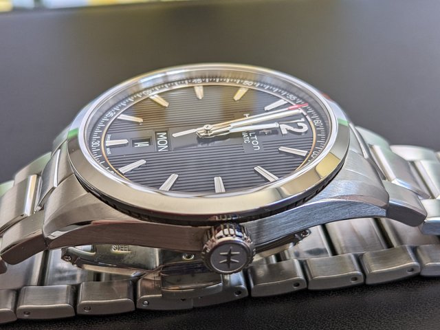 For sale is my Hamilton Broadway Day Date Auto. I am the original owner. Condition is very good as it has been worn sparingly and carefully. There are some marks on the back of the lugs from strap changes and typically light scratches on the bracelet consistent with normal use. No other issues.
