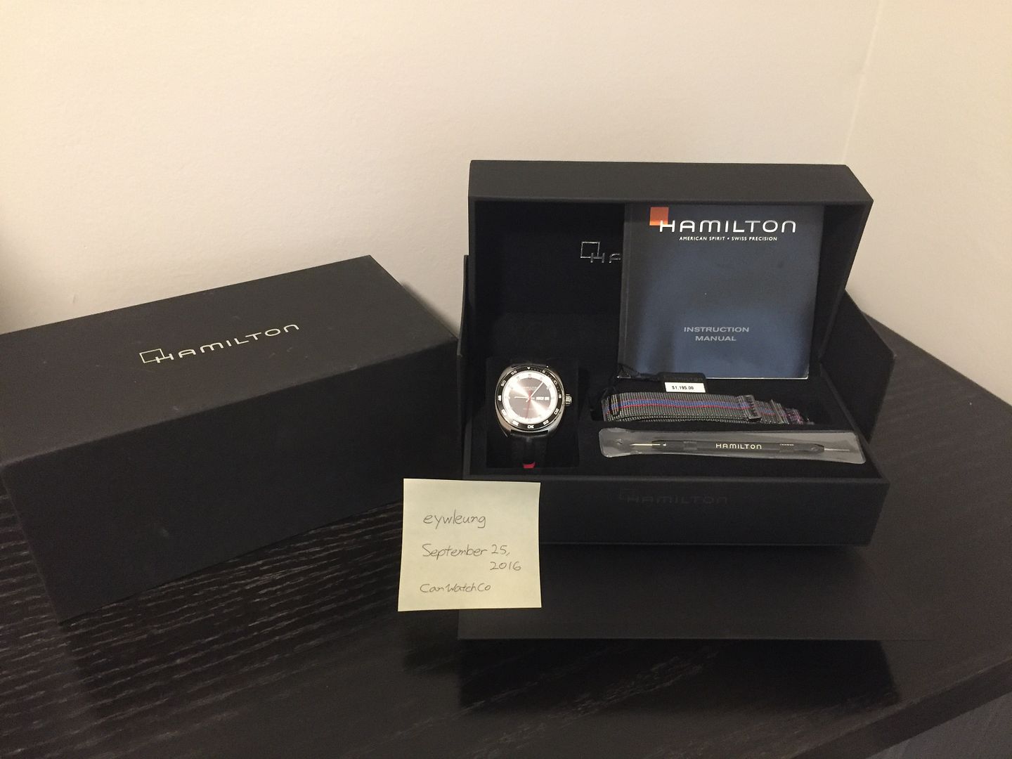 Set includes inner and outer box, nato strap (worn once), strap changing tool, manual. I am the original owner and will be able to provide copy of receipt with personal info blanked out. Purchased on Feb 24, 2016.