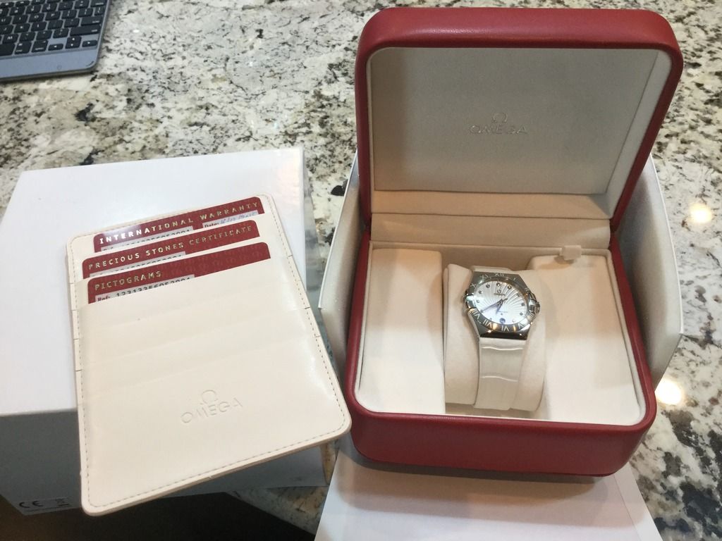 Full kit and in mint shape. Diamond markers, white leather strap shows virtually no signs of wear. This watch is in phenomenal condition.....perfect for the summer for your lady! $3400 shipped overnight!