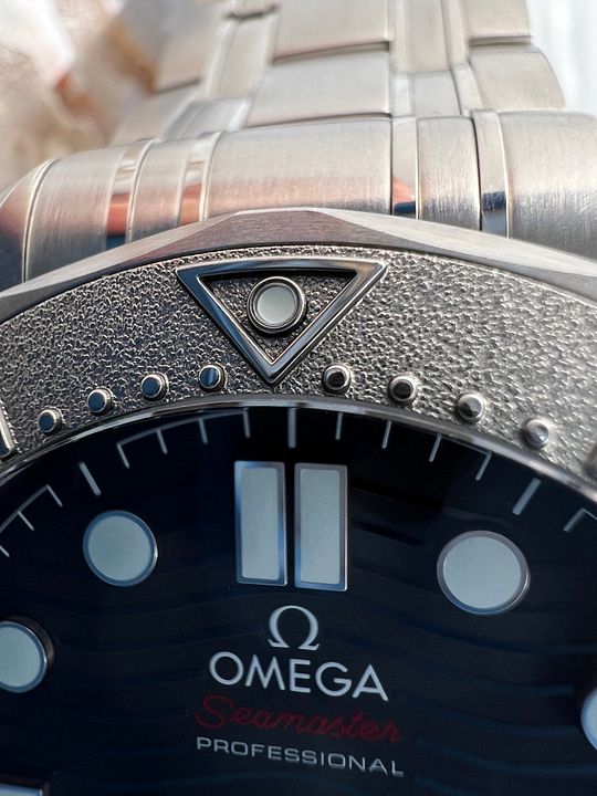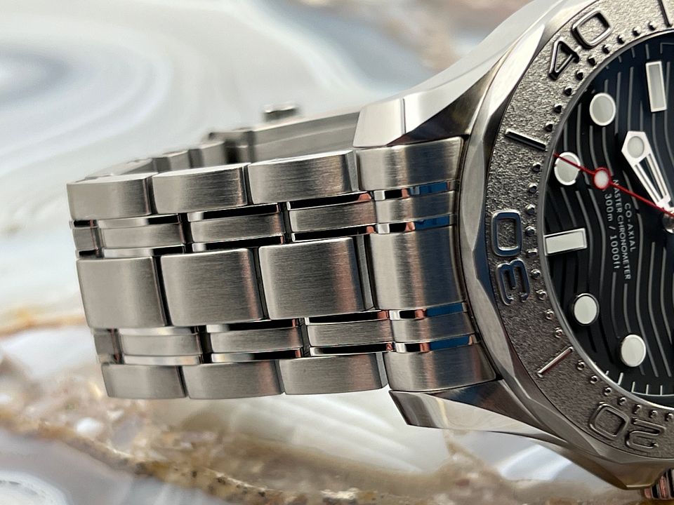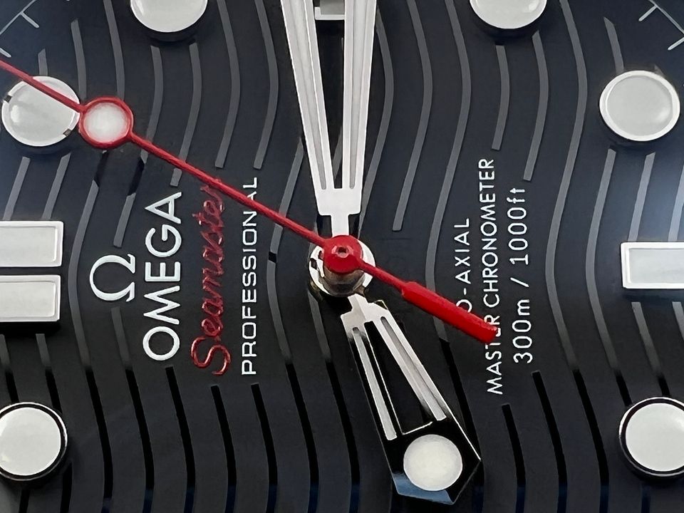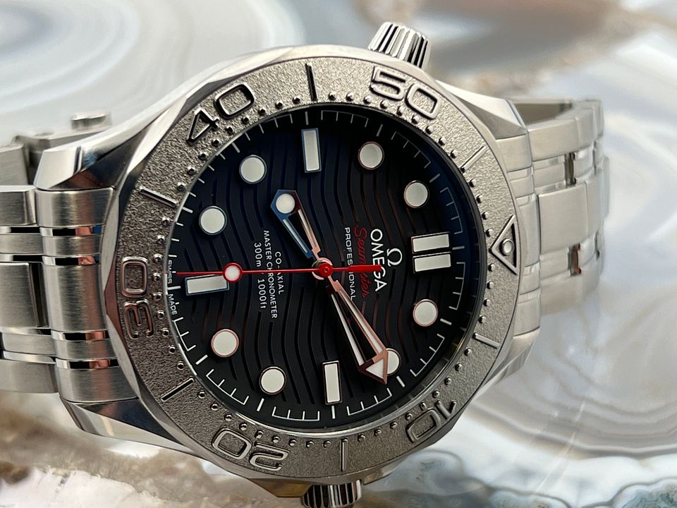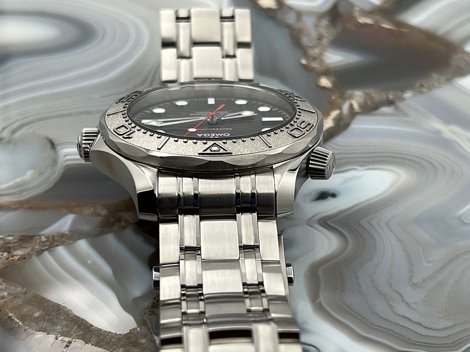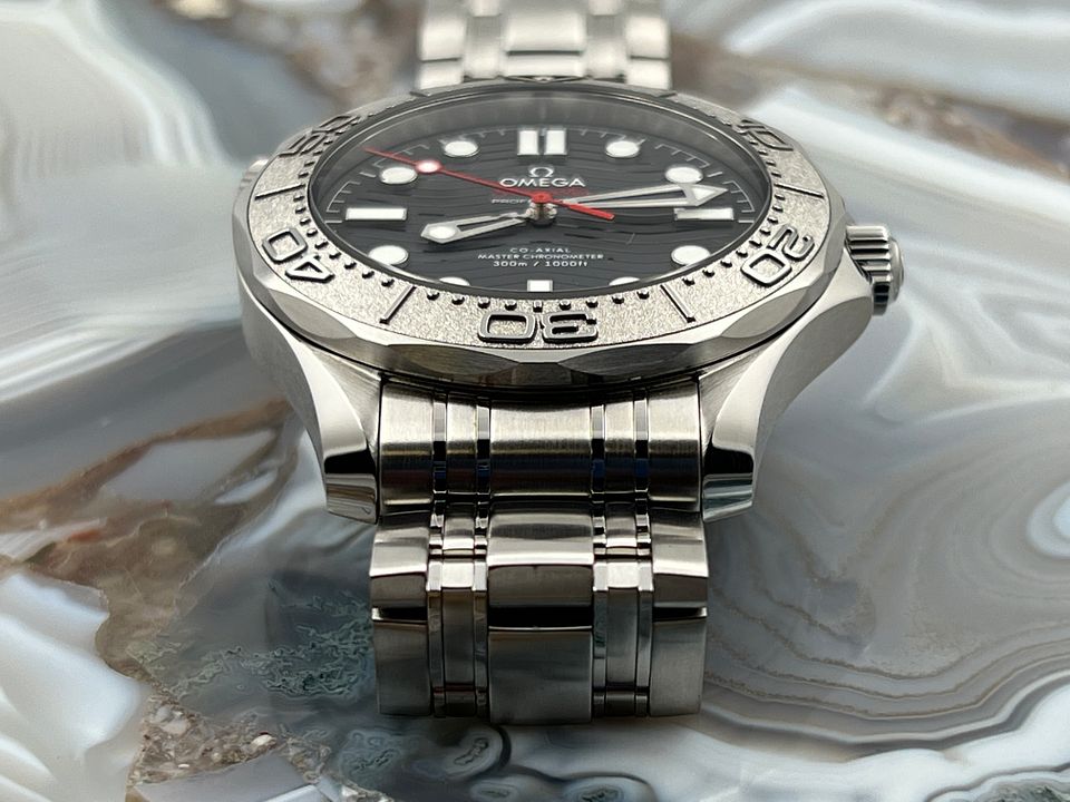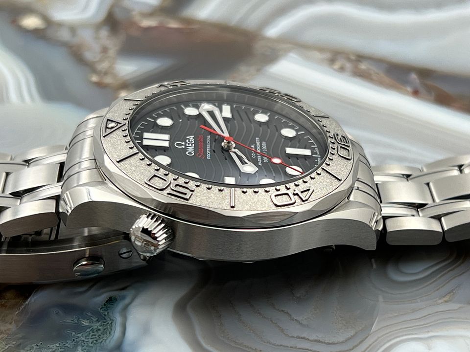 This 42 mm Seamaster Diver 300M, released in support of Nekton, has a polished-brushed stainless steel case and laser ablated black ceramic [ZrO2] dial, matt finished with polished waves in positive relief. The uni-directional rotating bezel is in grade 5 Titanium and features a laser ablated diving scale.