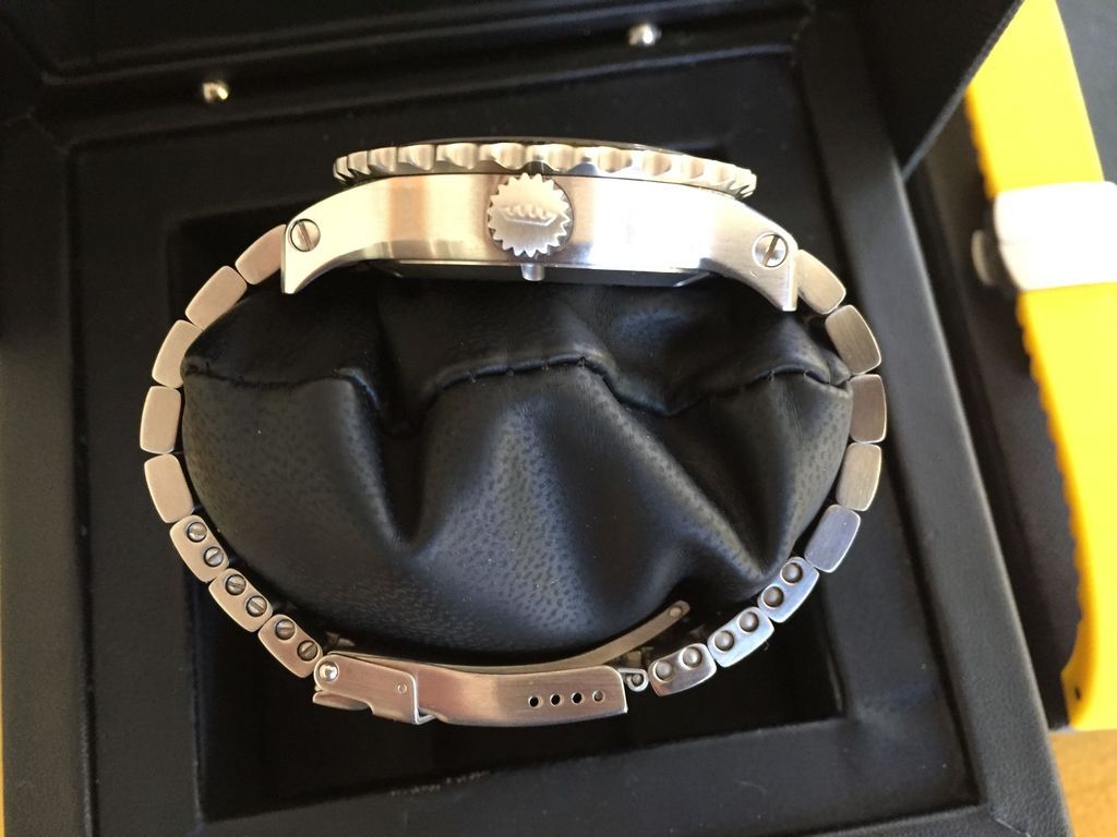 This is very nice looking tool watch reminecent of an IWC Aquatimer. Full kit is included with warranty card dated February 26, 2016.