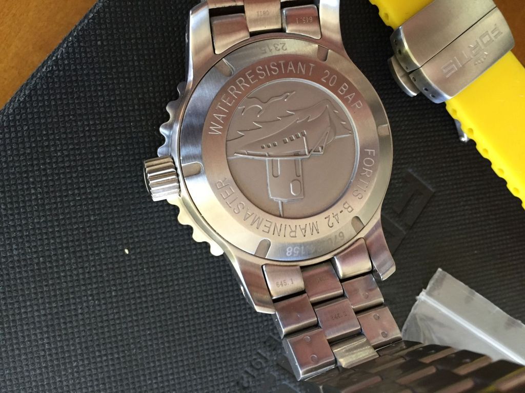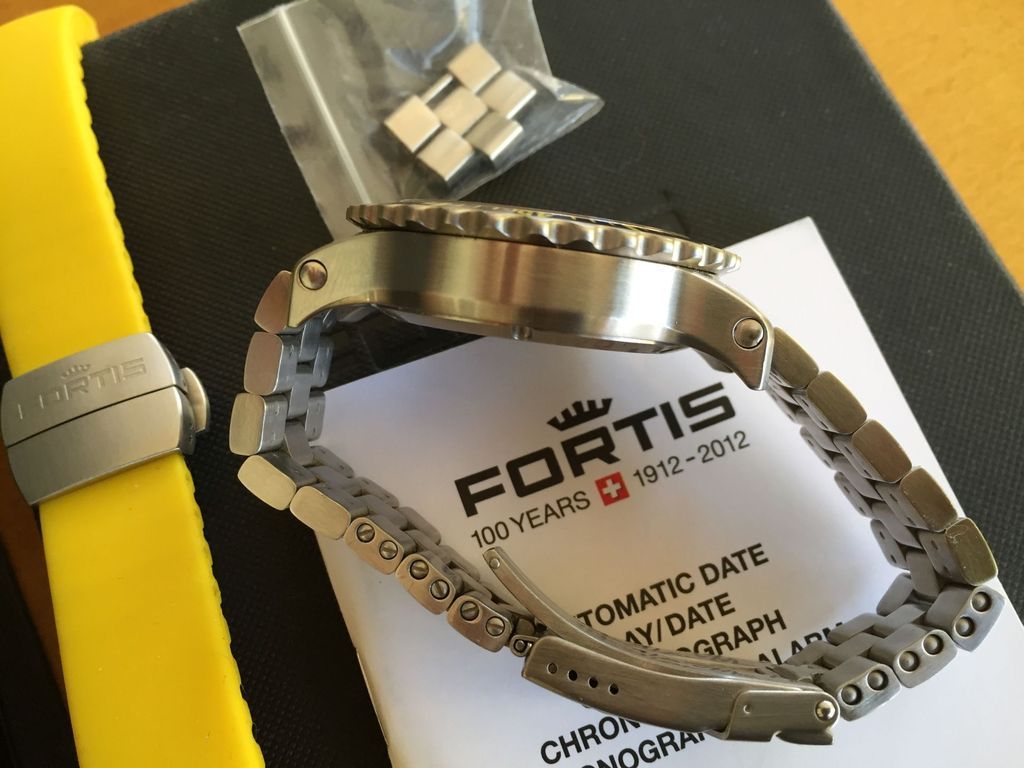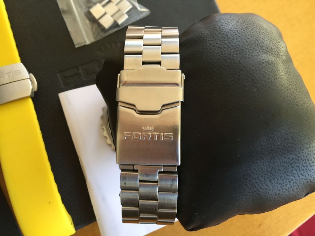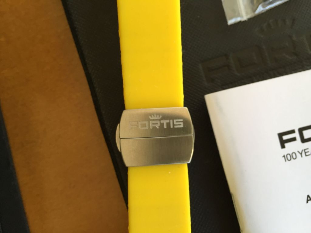 Also included a matching Fortis yellow silicone rubber strap with Fortis deployment clasp, a $200 value alone. The strap will fit up to a 7.5" wrist.