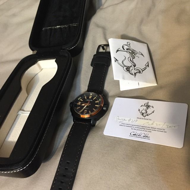 Another watch I'm looking to liquidate / trade. This one barely saw any wrist action. No scratches, dings, absolutely clean and the bezel is already developing its beautiful patina. Im the first owner, got it Feb of last year. Currently retails for $699 and is sold out here; http://cobra-de-calibre.myshopify.c...de-calibre-black-dial-bezel?variant=902419239