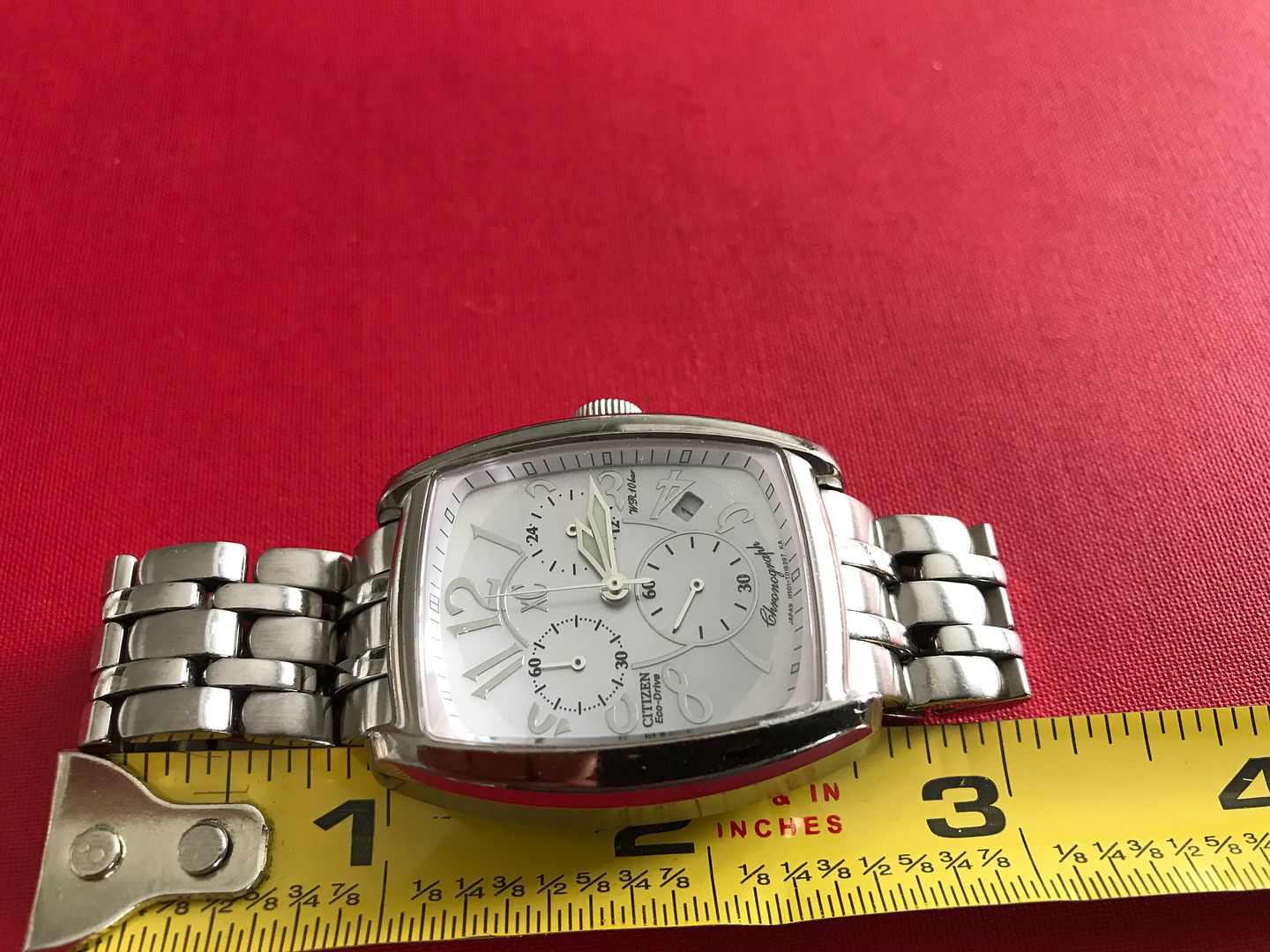 Citizen Eco Drive Chrono with Mop Dial works perfect will fit up to a 5.85 inch wrist.
