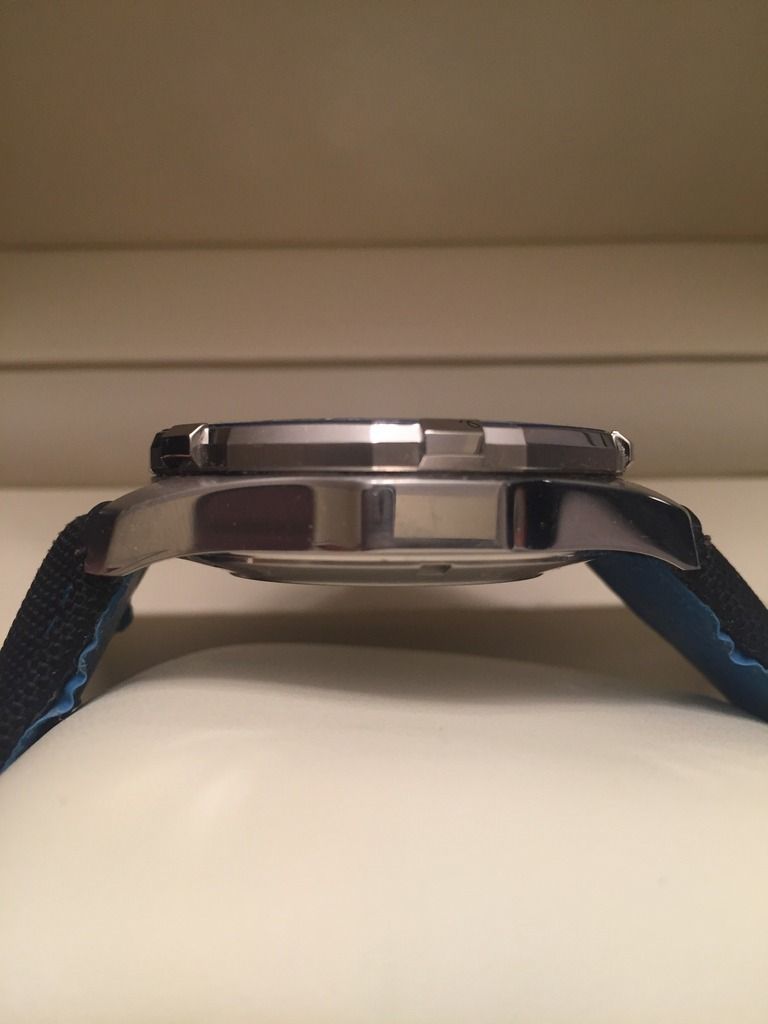 As I mentioned, it has been warn daily, quite carefully. That being said, there are some superficial scratches on the clasp, and especially on the high-gloss portions on the right and left sides (primarily because I set the watch down on the side whenever I was working on the computer). There is one dent in the bottom right corner of the metal portion, but there are no associated cracks or breaks in the bezel around that area. There is also some peeling of the underside of the bracelet as I prefer to wear it quite tightly.