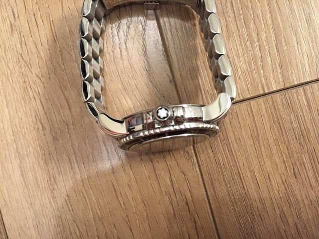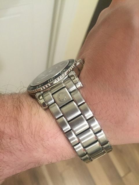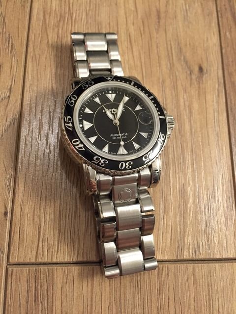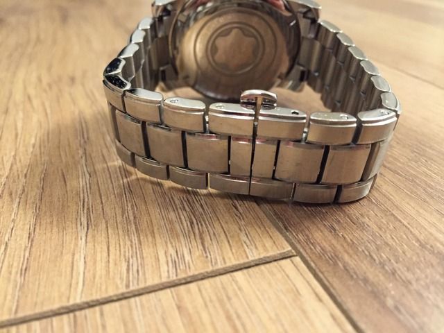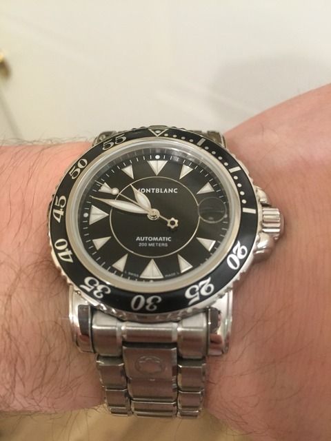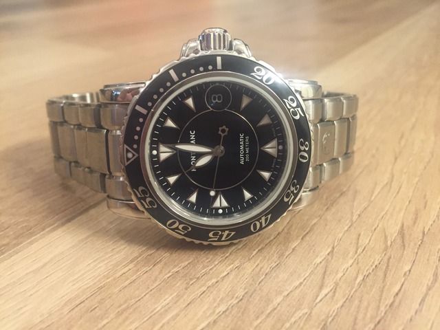 For sale here I have a Montblanc Sport model 3275. This watch is the 38mm auto version. I have no service history on this watch, it keeps good time and looks healthy on the timegrapher. This watch is hard to come by, so if you have been hunting for one, here is your chance. Watch shows the typical desk diving marks, bracelet has had a polish in the past.