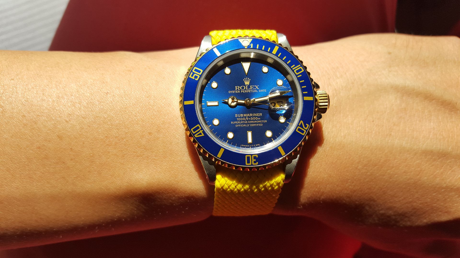I will also include a blue Hirsch rubber strap and matching blue/yellow nato strap from natostrapcollections for when you want to dress down the Bluesy, as well as the Rolex service pouch and polishing cloth.