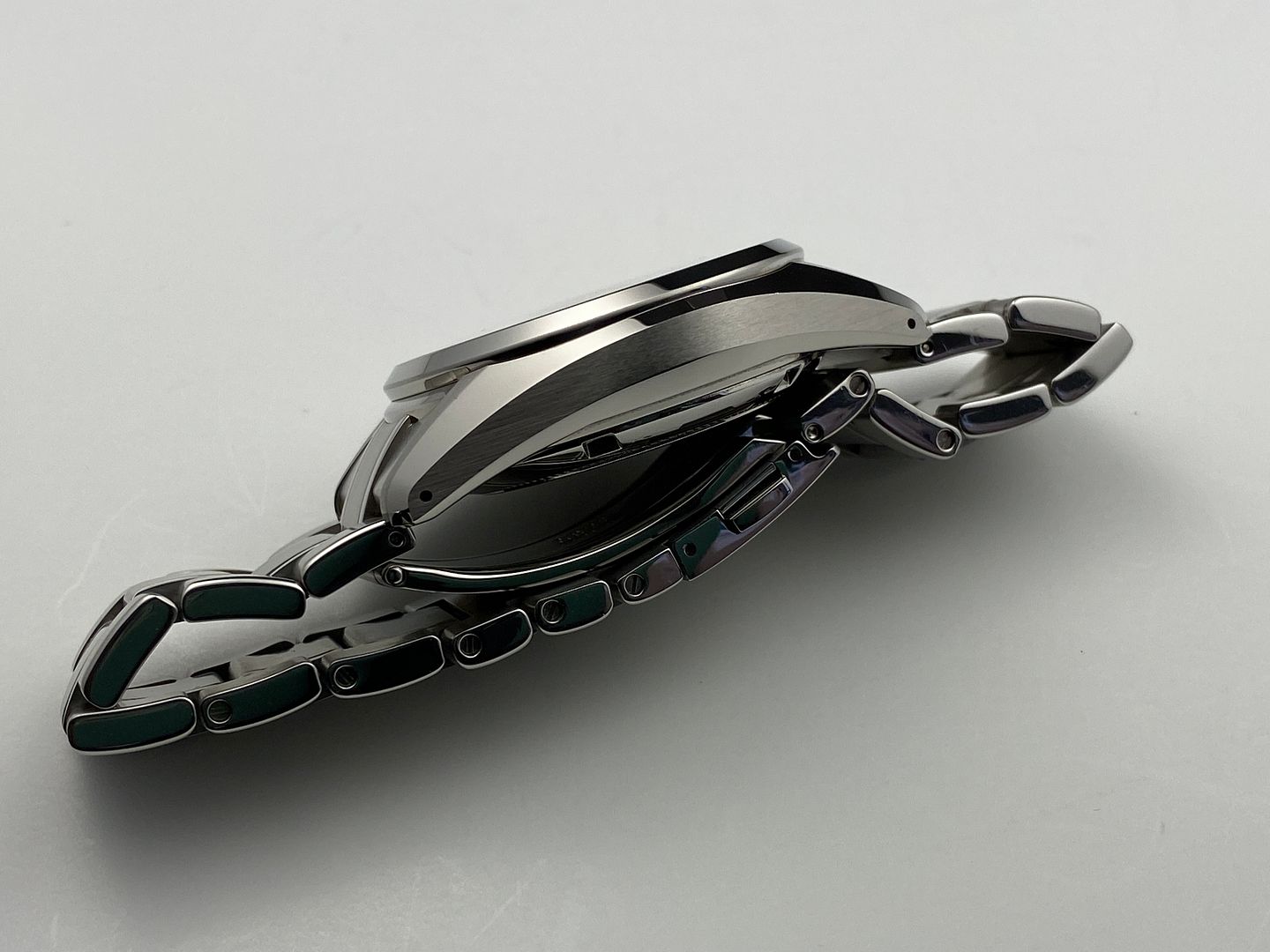 This 40mm wide and 13mm thick case fits comfortably on the wrist with 36000 beats humming away accurately.