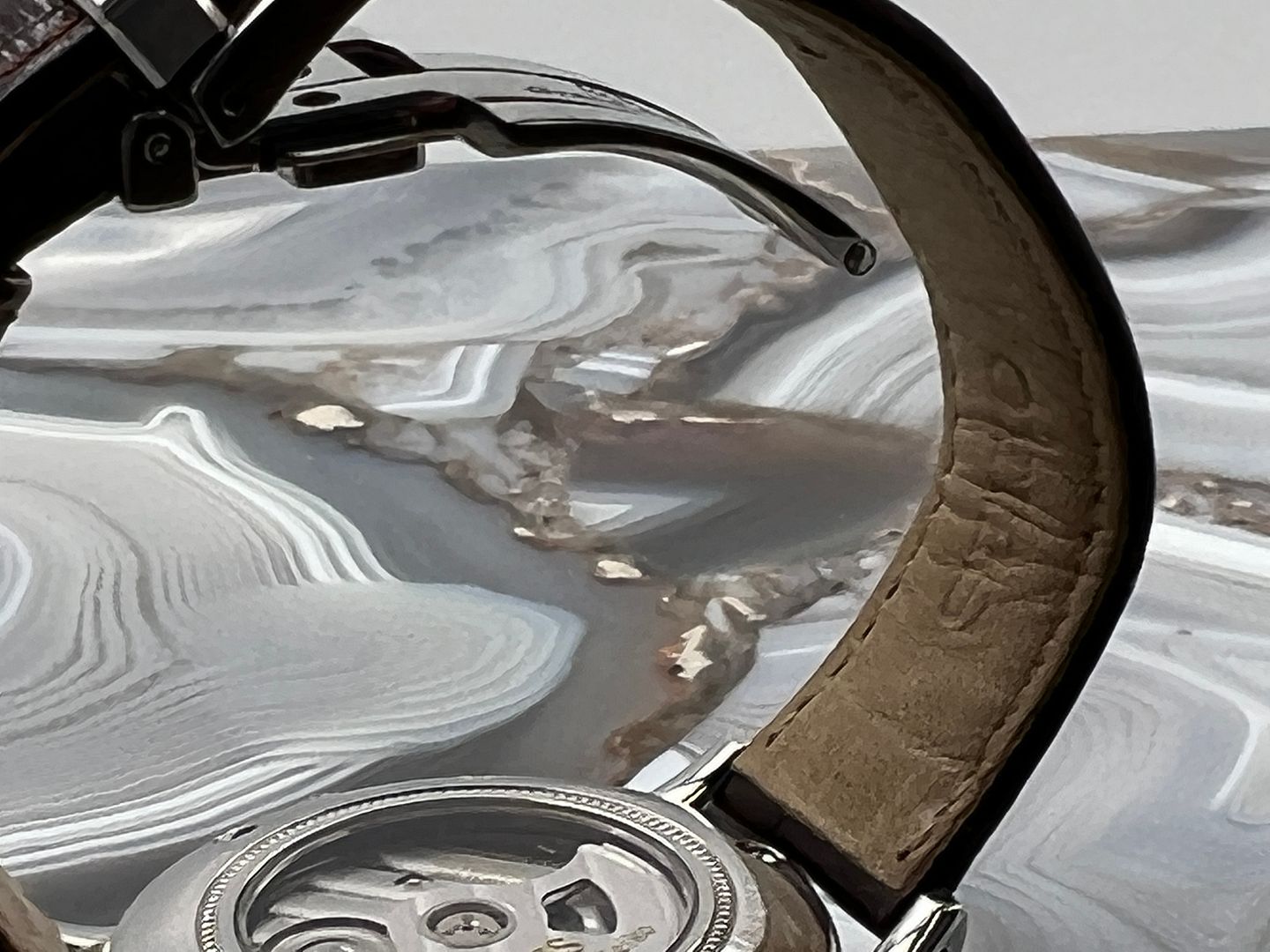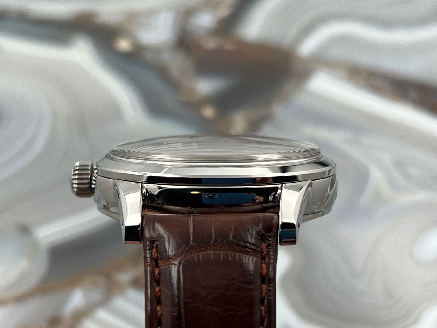 Strap: Brown crocodile leather strap presented on a stainless steel three-fold clasp with push button release.