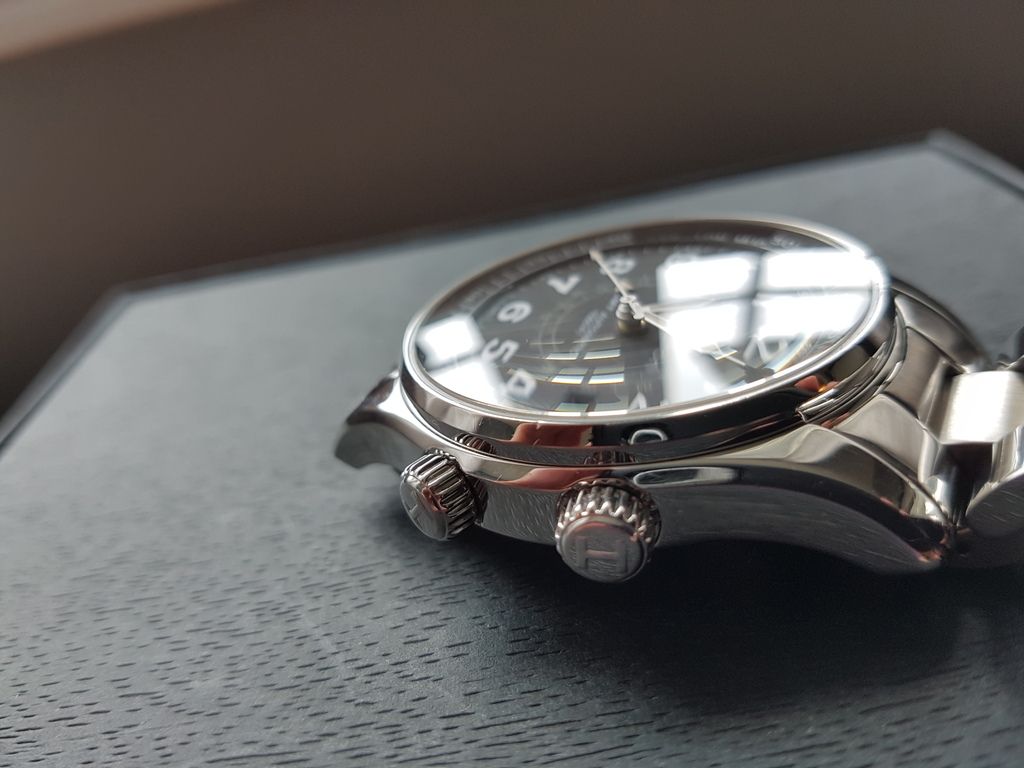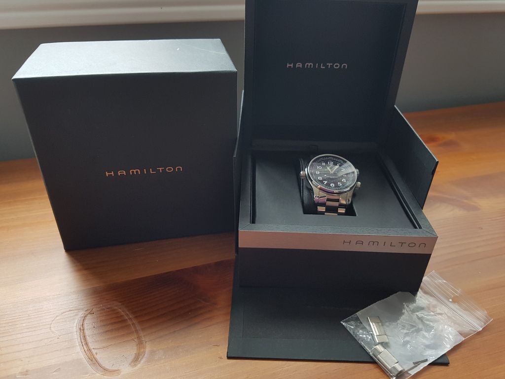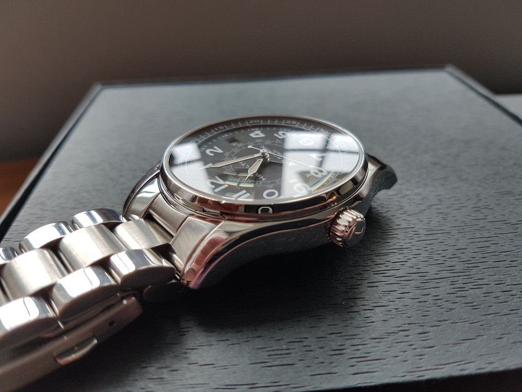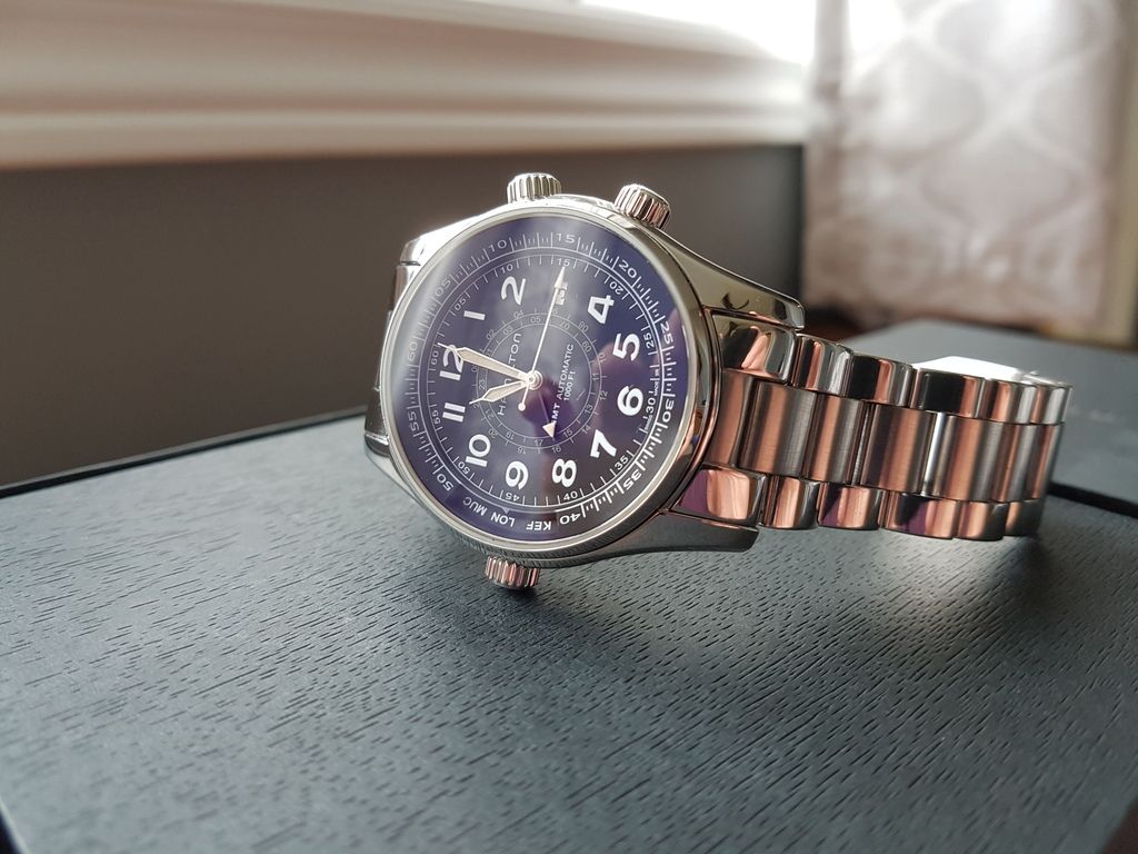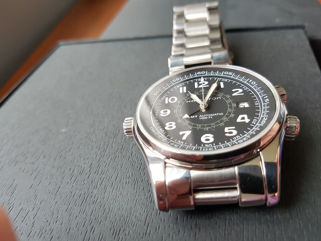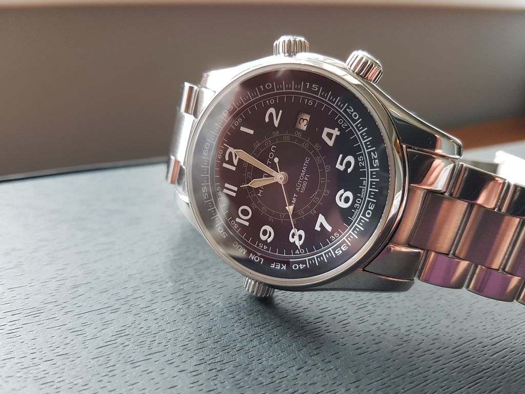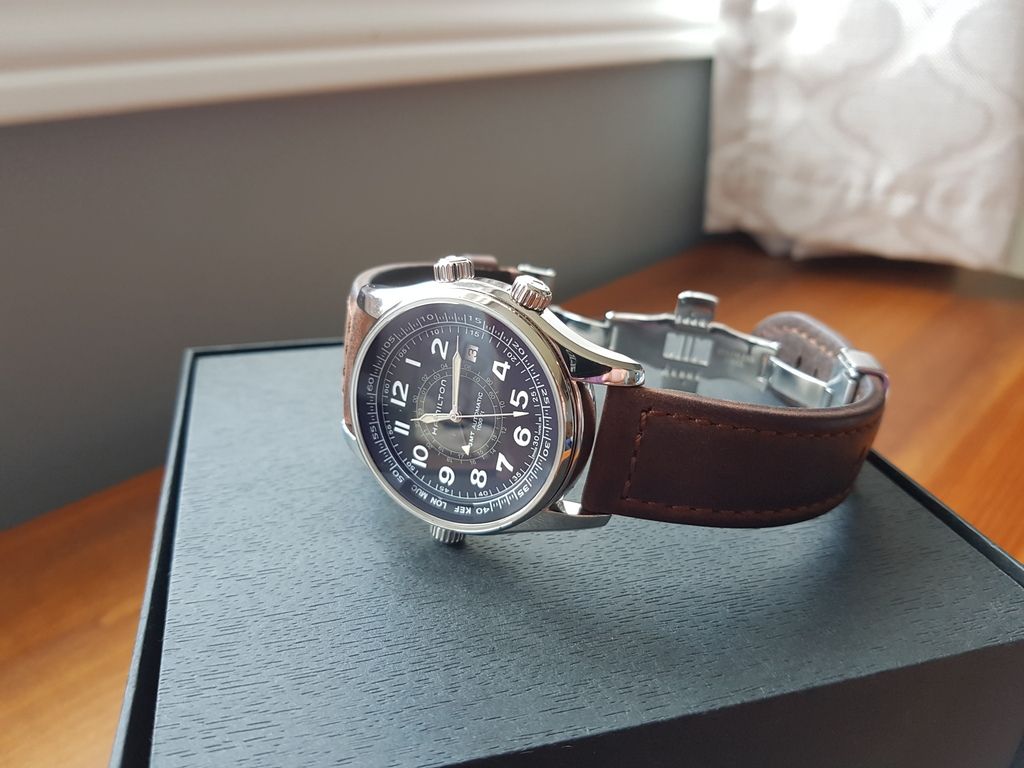 This is one of Hamilton's higher end pieces and has some features not found on the usual Hammy. Its a really interesting watch that combines vintage style with some nice modern touches as well. It use a GMT movement and uses "sidereal time" to figure the time in different locations using airport codes on 2 inner rotating bezels operated by two separate crowns. The watch is anti magnetic and 1000 feet water resistant!