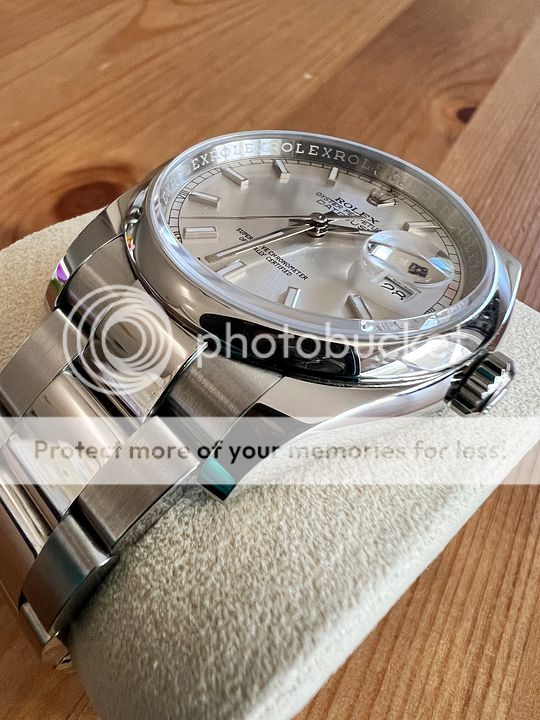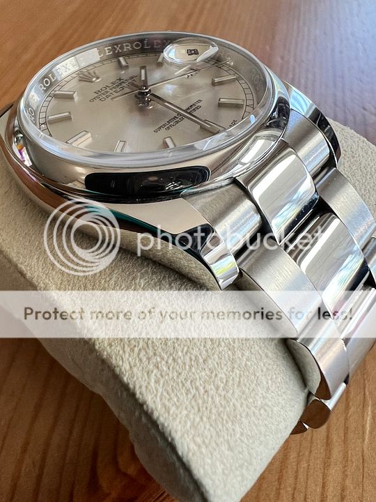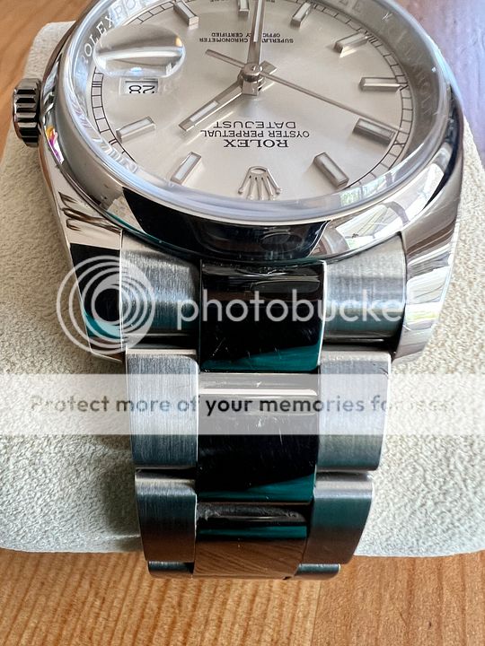 Looking to sell my Rolex DJ 36 mm with a silver dial and index markers. I am the original owner and purchased the watch from Howard Fine Jewellers in Ottawa in March 2019. Watch was worn regularly, as evidenced by the light swirls and surface scuffs. No major dents or scratches. Keeps time at -2/+2 per day.