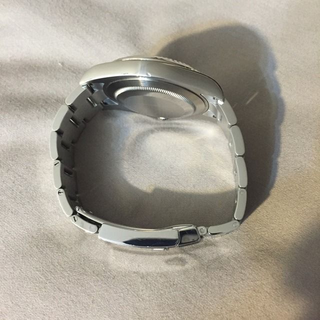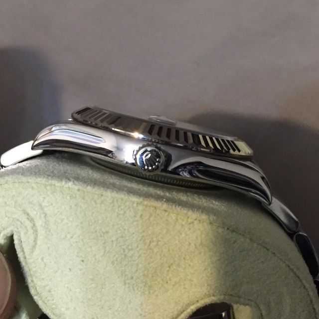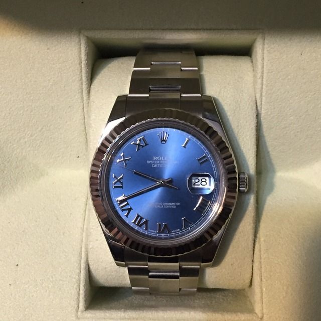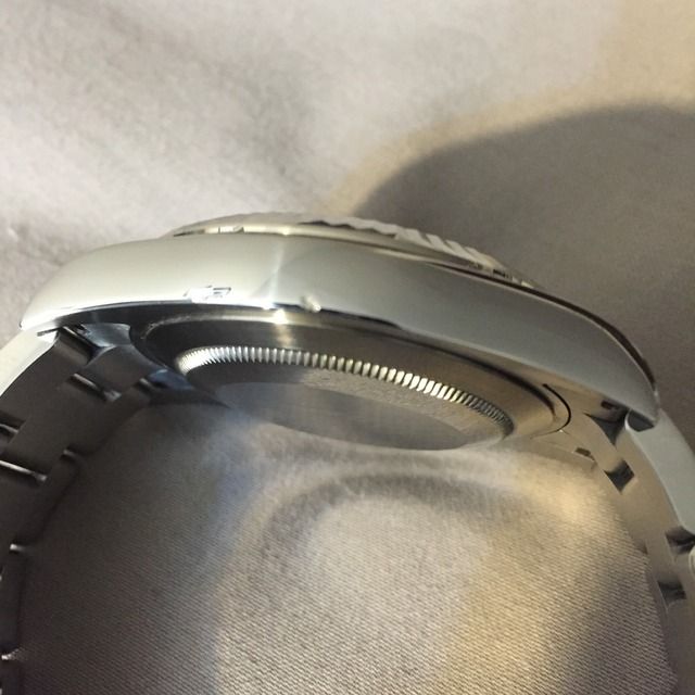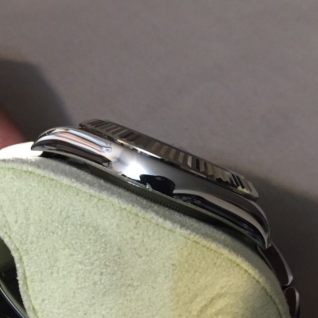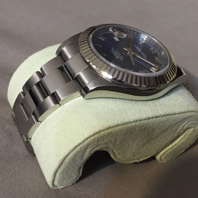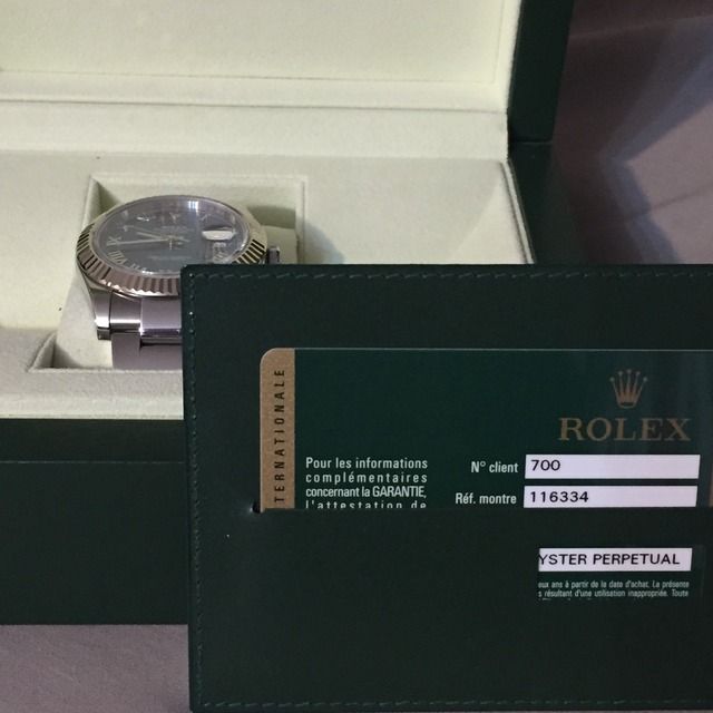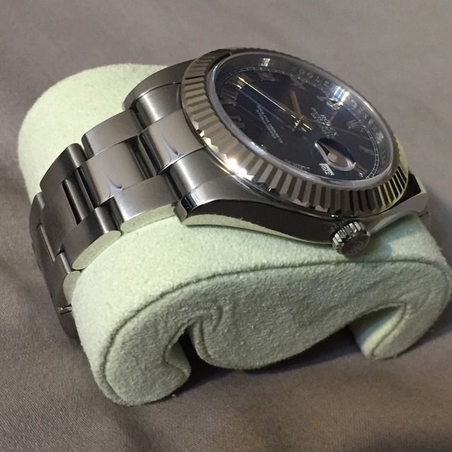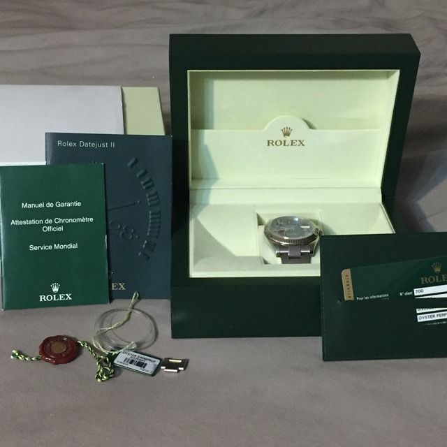 Selling my Rolex Datejust II with really nice 18k fluted bezel. Watch is in excellent condition save for minor swirlies and a fair sized ding on the case side (9 o'clock) near the case back. The ding is not noticeable at all when you're wearing the watch. Complete set, white slip box, Rolex box, Green presentation case, green hang tag, chronometer tag, warranty card and book, manual, bezel protector. You get everything you see in the picture. G serial.