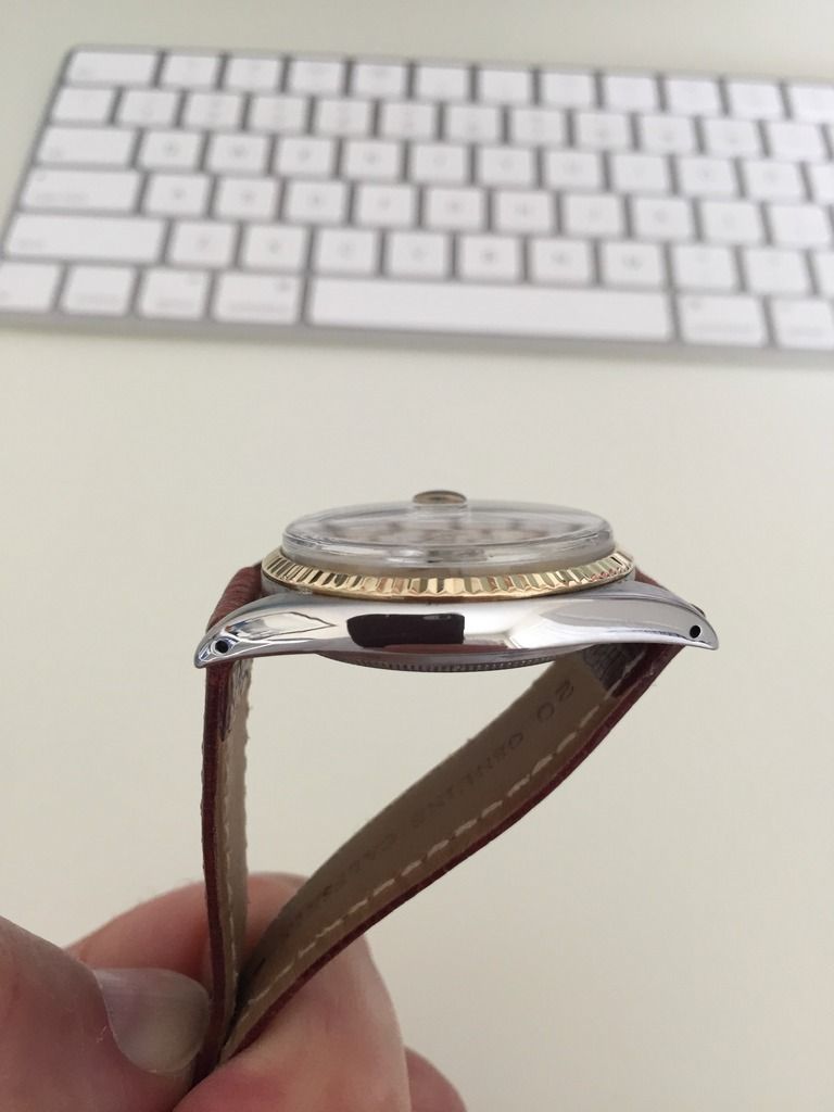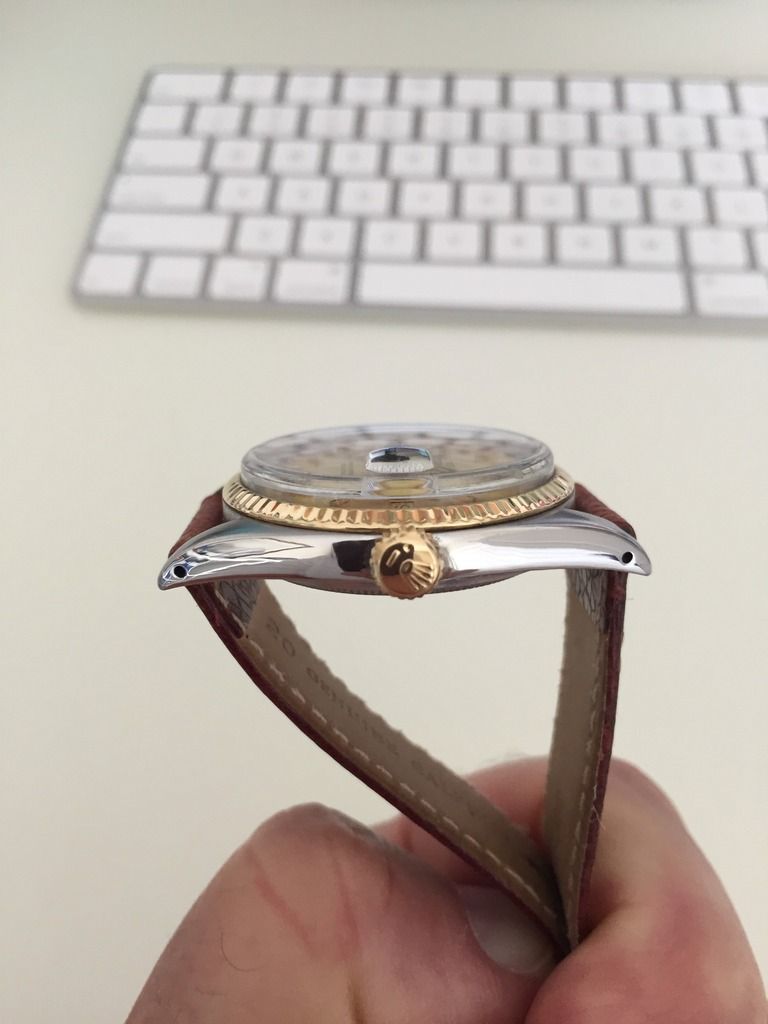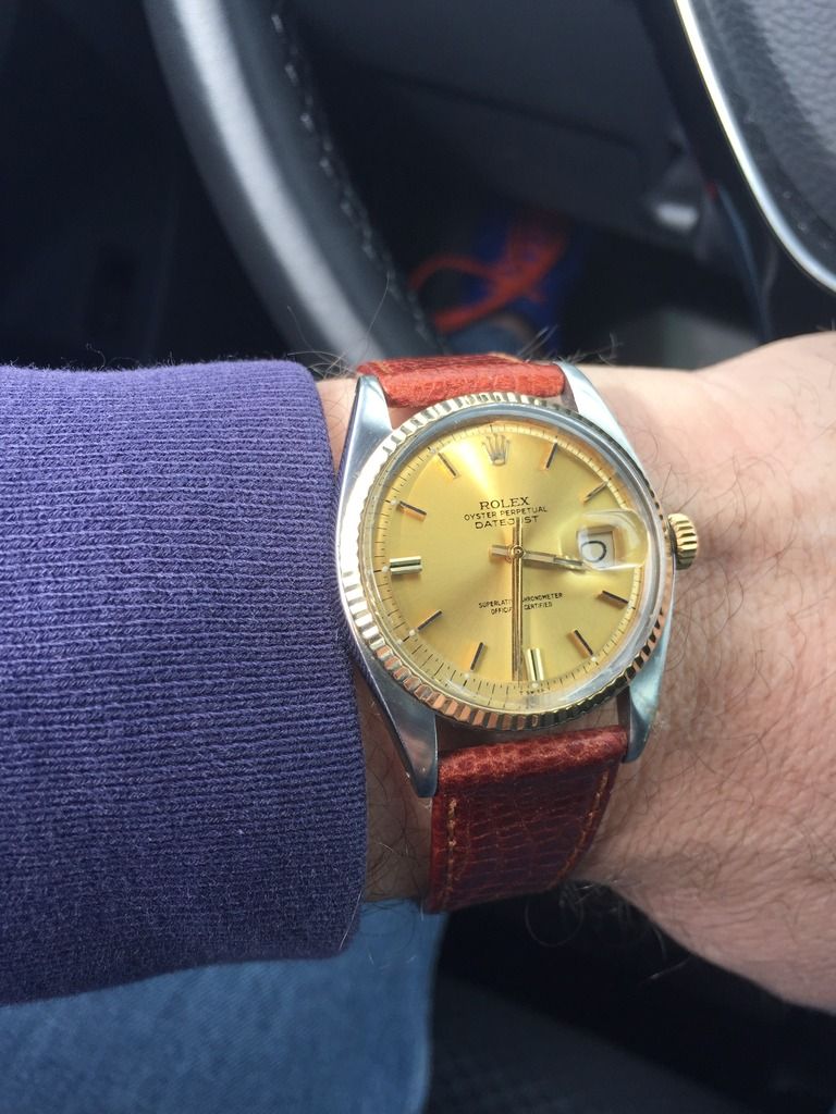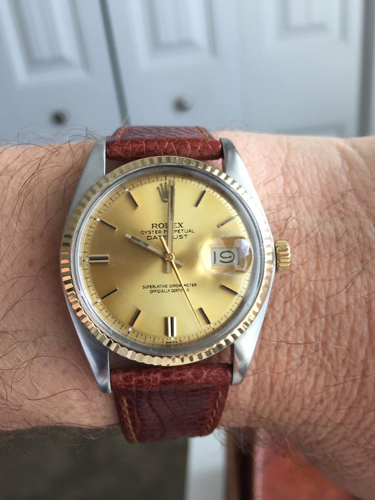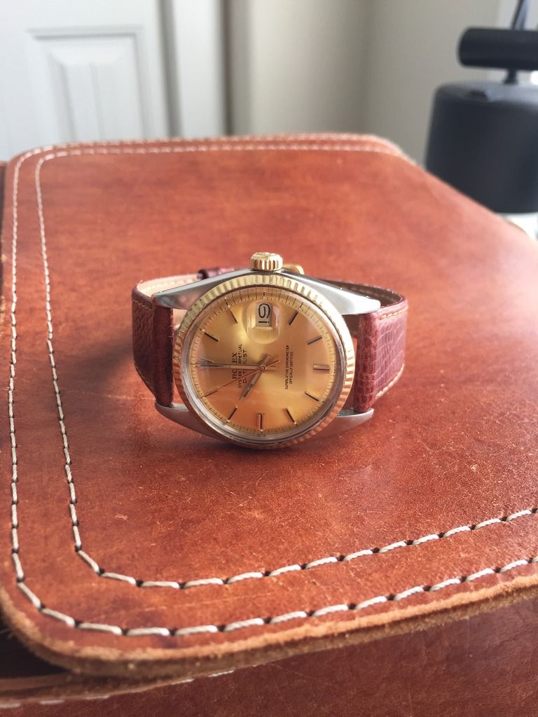 For sale is a classic Rolex Datejust ref # 1601 in 14K and S/S. Rolex automatic movement with a beautiful gold dial, 3.2mil serial dates approx 1971. Recently inspected by a local watchmaker to confirm all original and in good working order. The sale is for the watch only on generic leather strap, no box or papers. The crystal has a small nick which is only noticeable if you look on the side, The case has usual wear as you'd expect from a watch of this age with light scratches from strap change etc. I have been wearing it for the last month and it keeps excellent time.