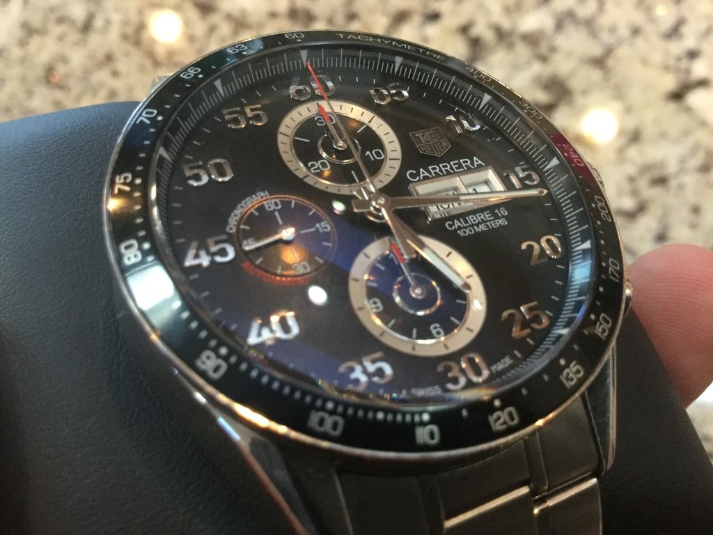 For sale is a lightly used Tag Heuer Carrera Chronograph. It has the usual swirlies on the bracelet and case for a watch of this age, but no dings or major scratches. A trip to the jeweller for a light buff and it will look like new. No boxes/papers with this one but comes in a Tag Service box. Bezel and crystal are in excellent condition.