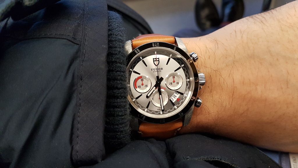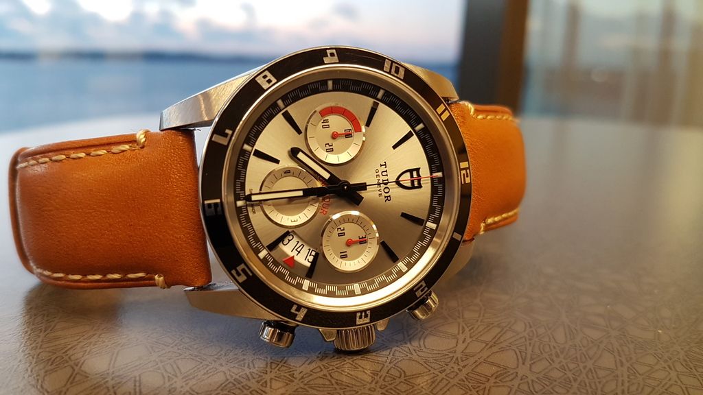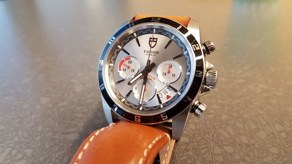 For sale or trade is my 44mm gorgeous Tudor Grantour Automatic Chronograph. The watch comes with Stainless steel tudor bracelet with 24mm lugs. The watch is in 9/10 condition and functions flawlessly. This watch has 2 unique features. Firstly, the chrono pushers lock and unlock with 1/4 turn. Secondly, there is a small button on the back of the 2 o'clock lug which is pressed to advance the date feature. No papers, box only, authenticity verified and guaranteed 100%