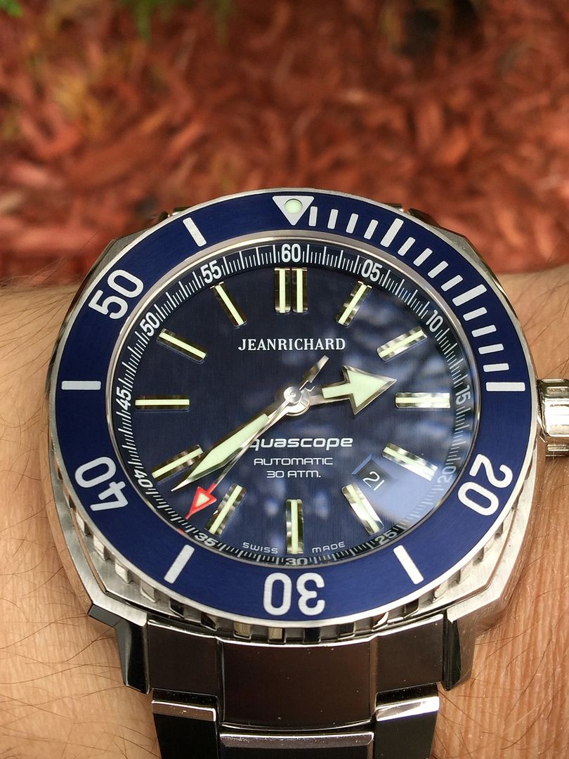 Up for sale is a blue vertically satin brushed dial/bezel Aquascope on bracelet. The previous owner told me it was purchased in July from Ashford but the JR warranty card is not stamped or dated. For those of you who don't know the brand, it is owned by Girard Perregaux and is seen as their "Tudor" so to speak.